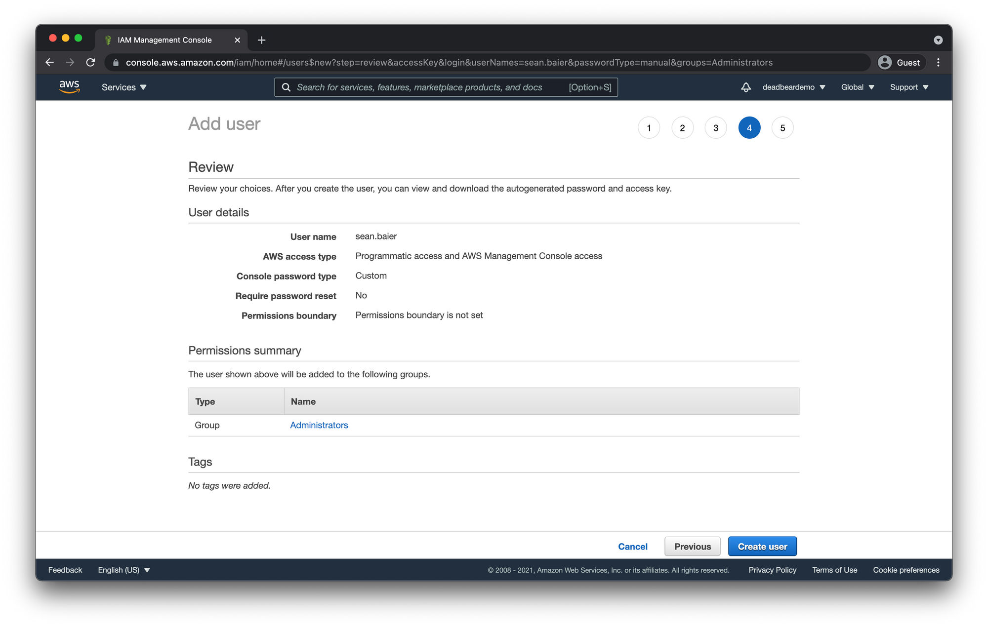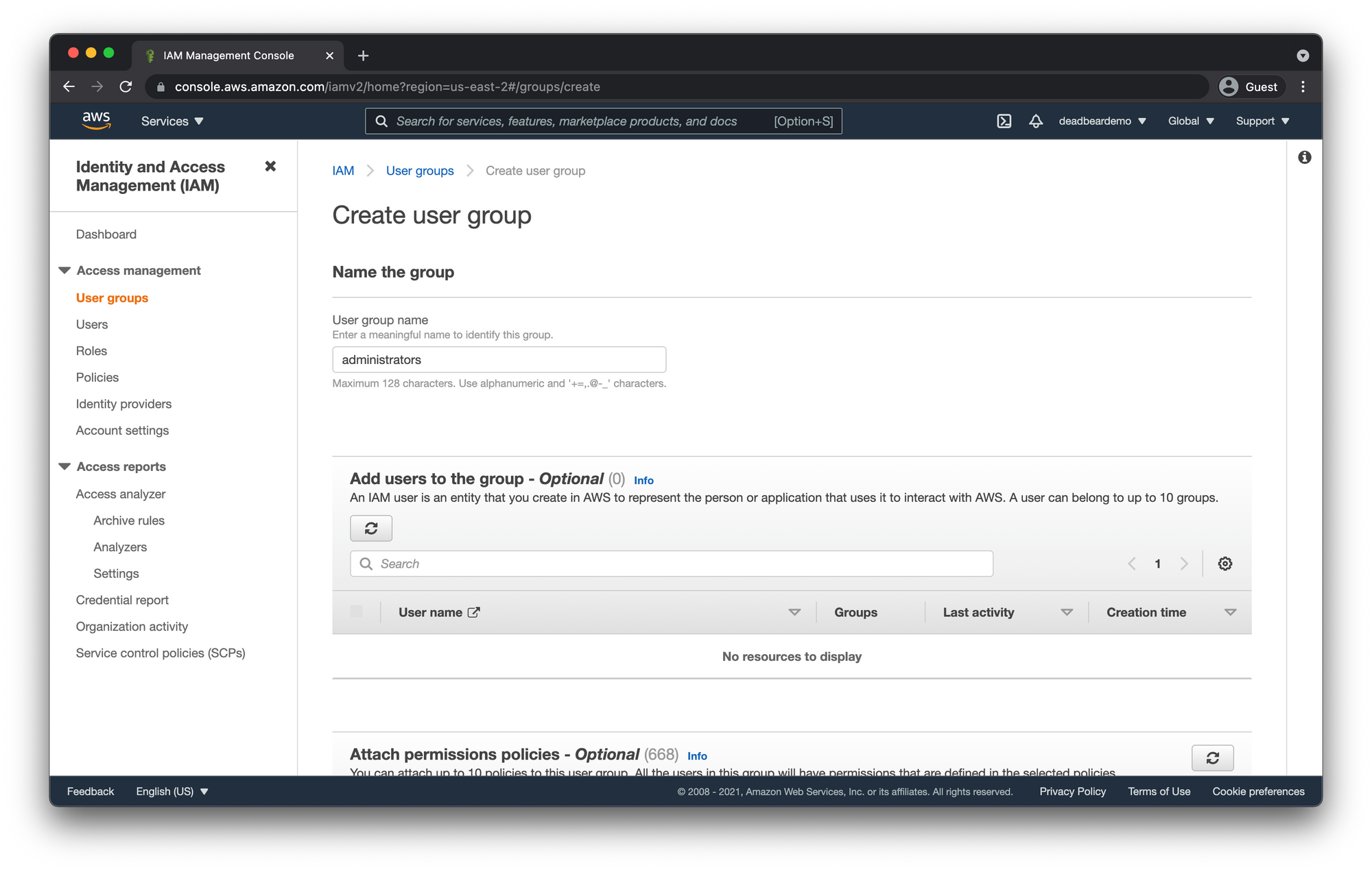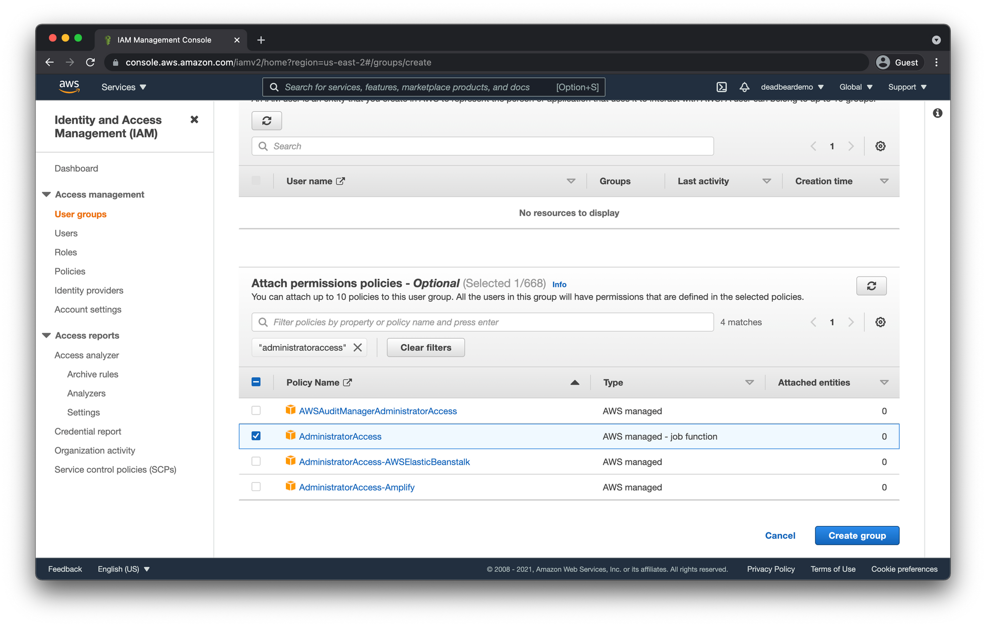You can skip the Add users to the group section for now since we haven't created our user yet.