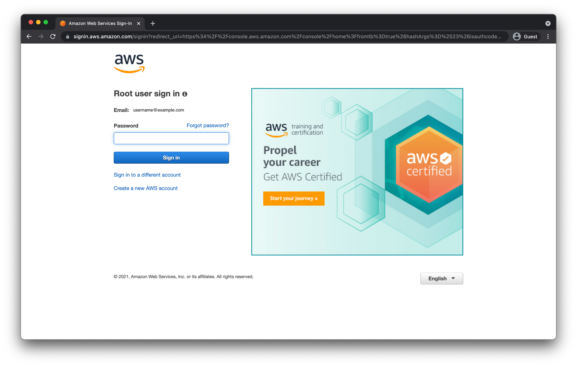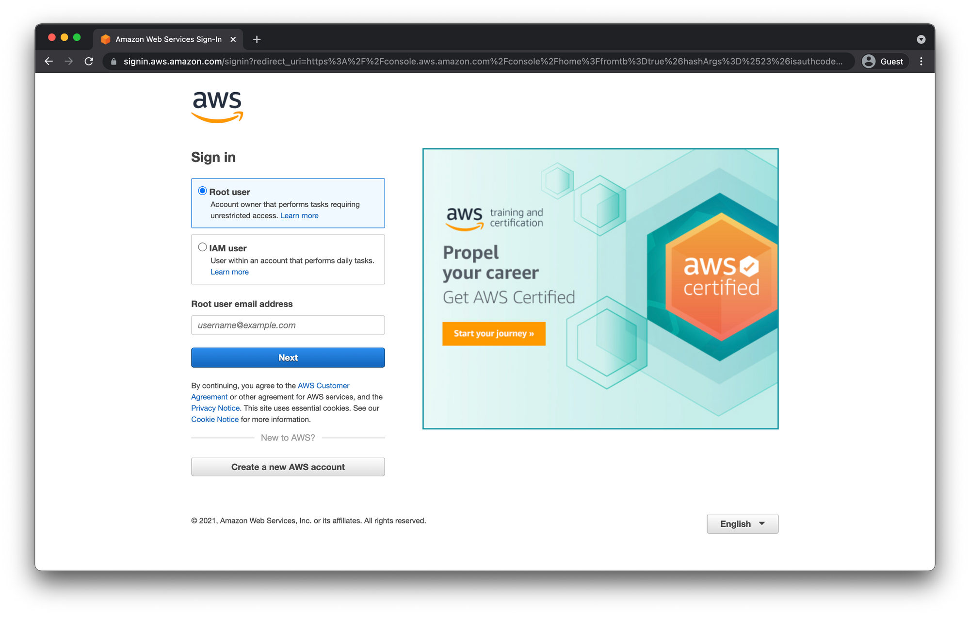 You should be redirected to the AWS Console Sign in page. As mentioned before the email and password you entered earlier are you Root user credentials.