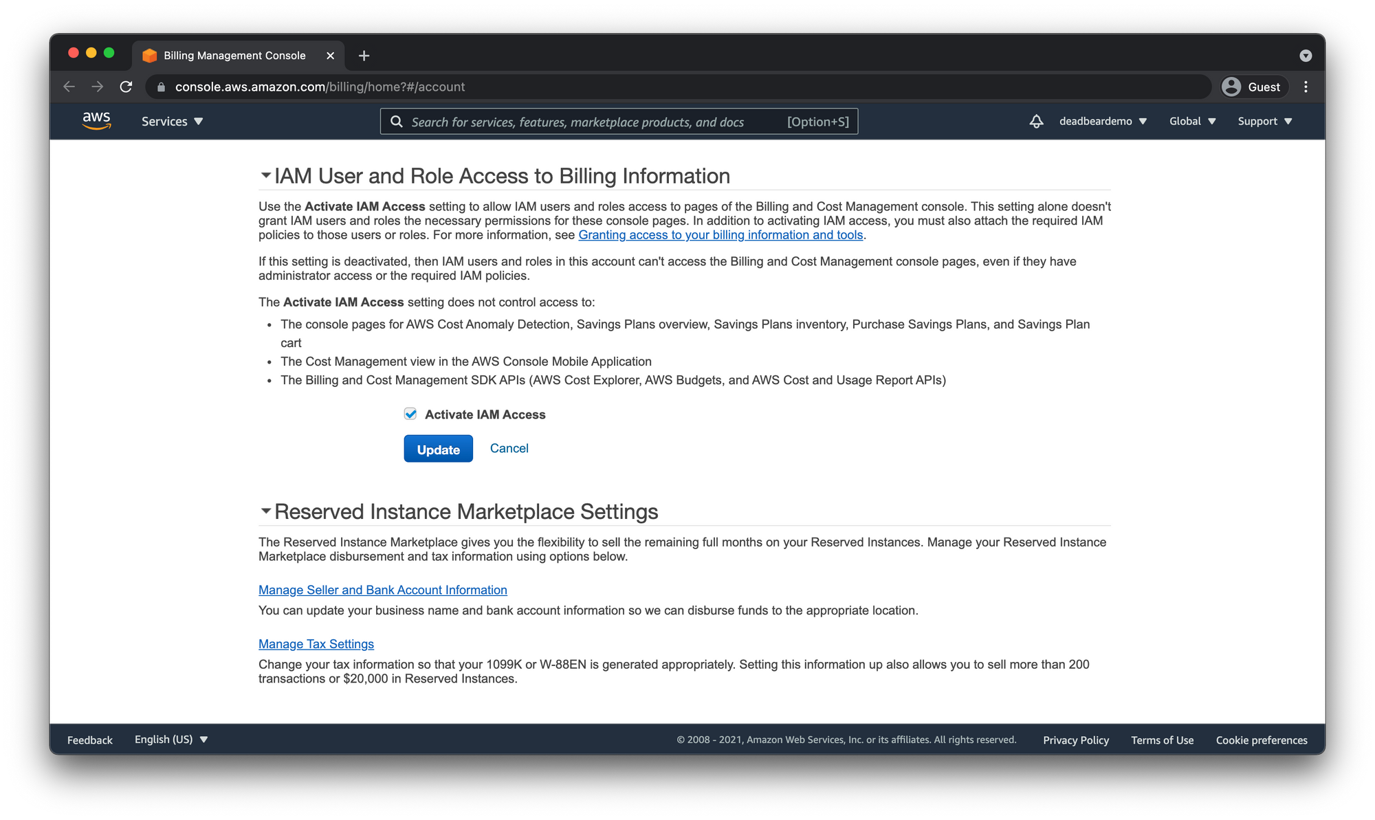 Once in the My Account dashboard scroll all the way down until you see "IAM User and Role Access to Billing Information"