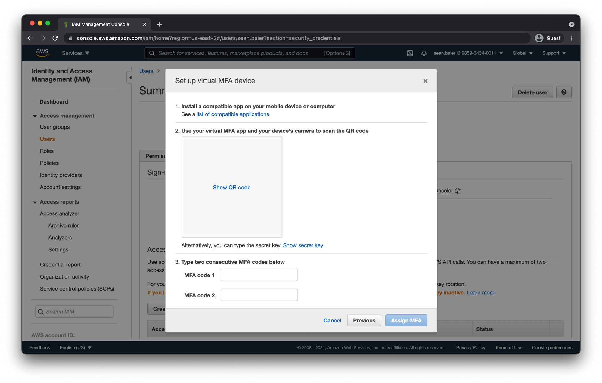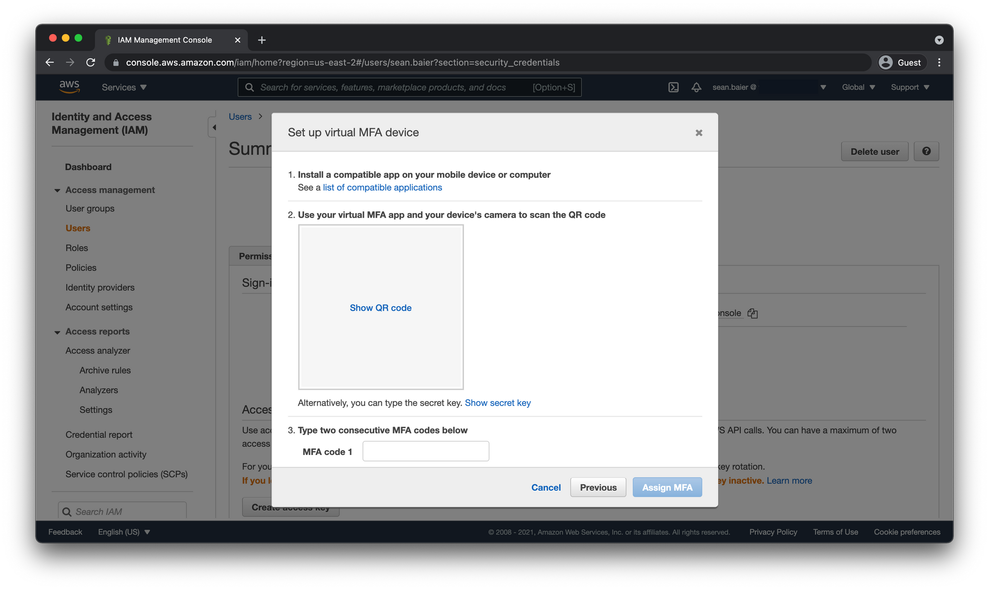Use your MFA app and sync with your AWS account. Enter the two codes and click "Assign MFA"