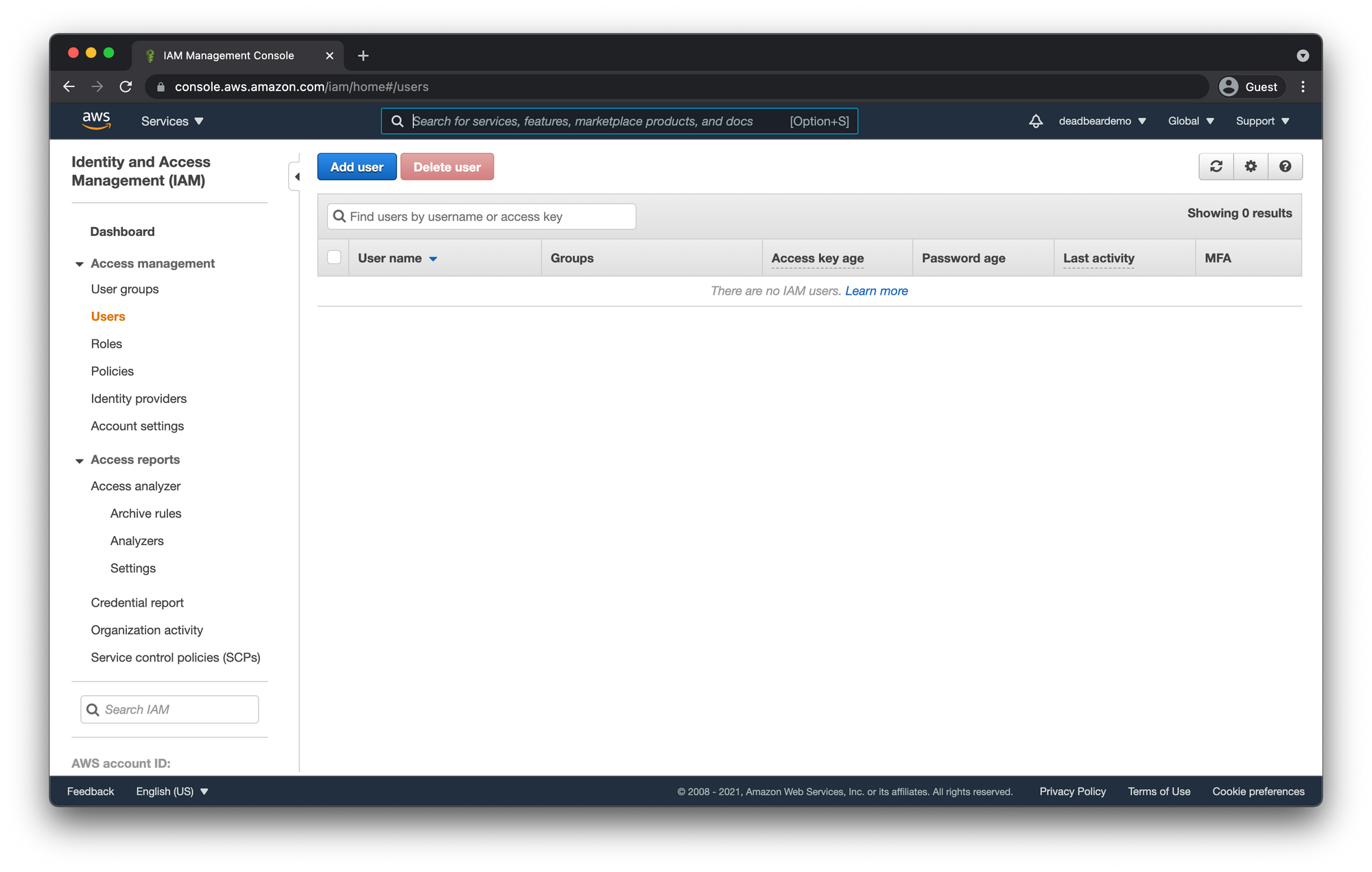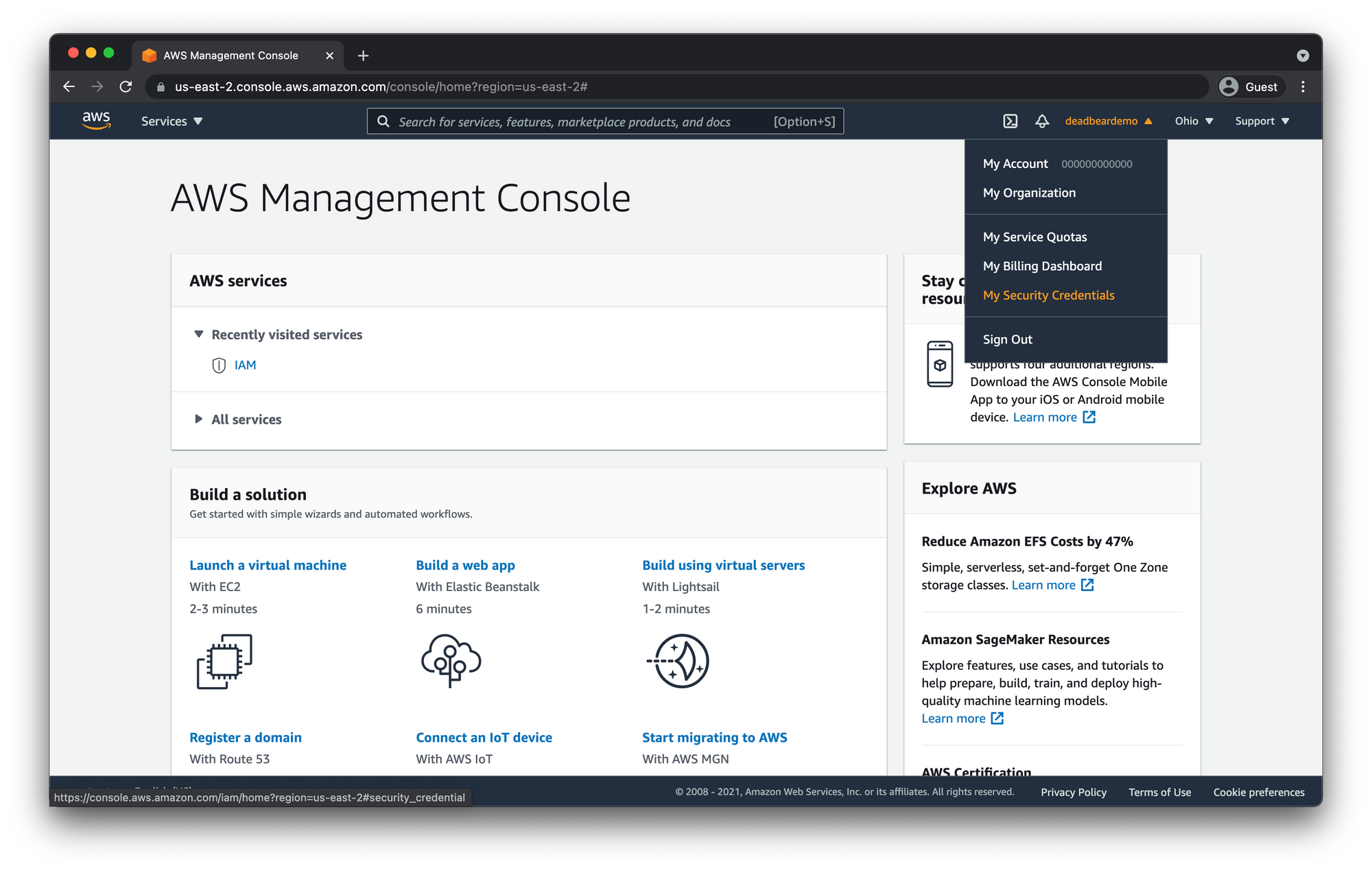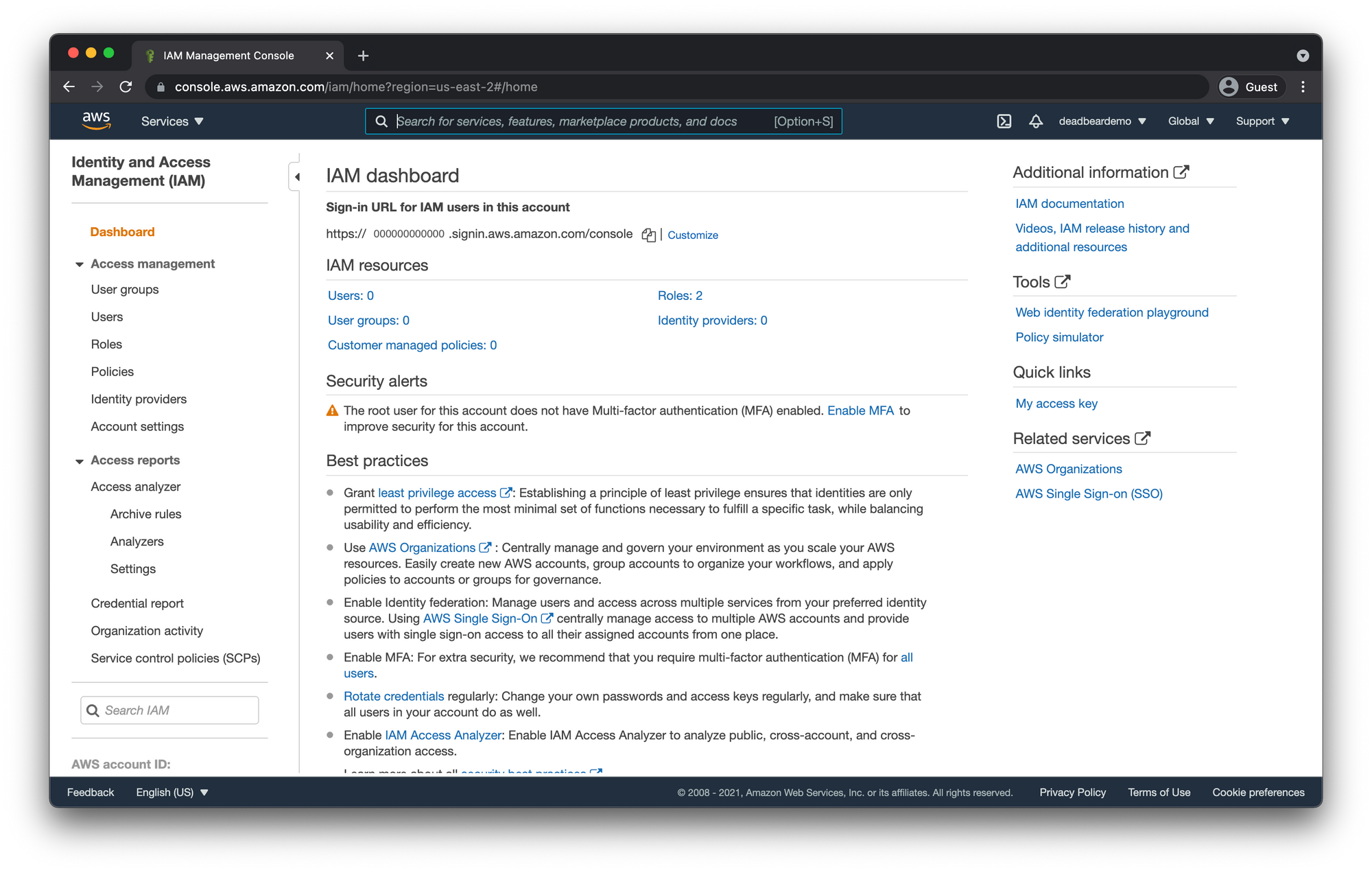 Now you should be logged into your account, but before you start going crazy and provisioning resources, AWS recommends doing a little security housekeeping.