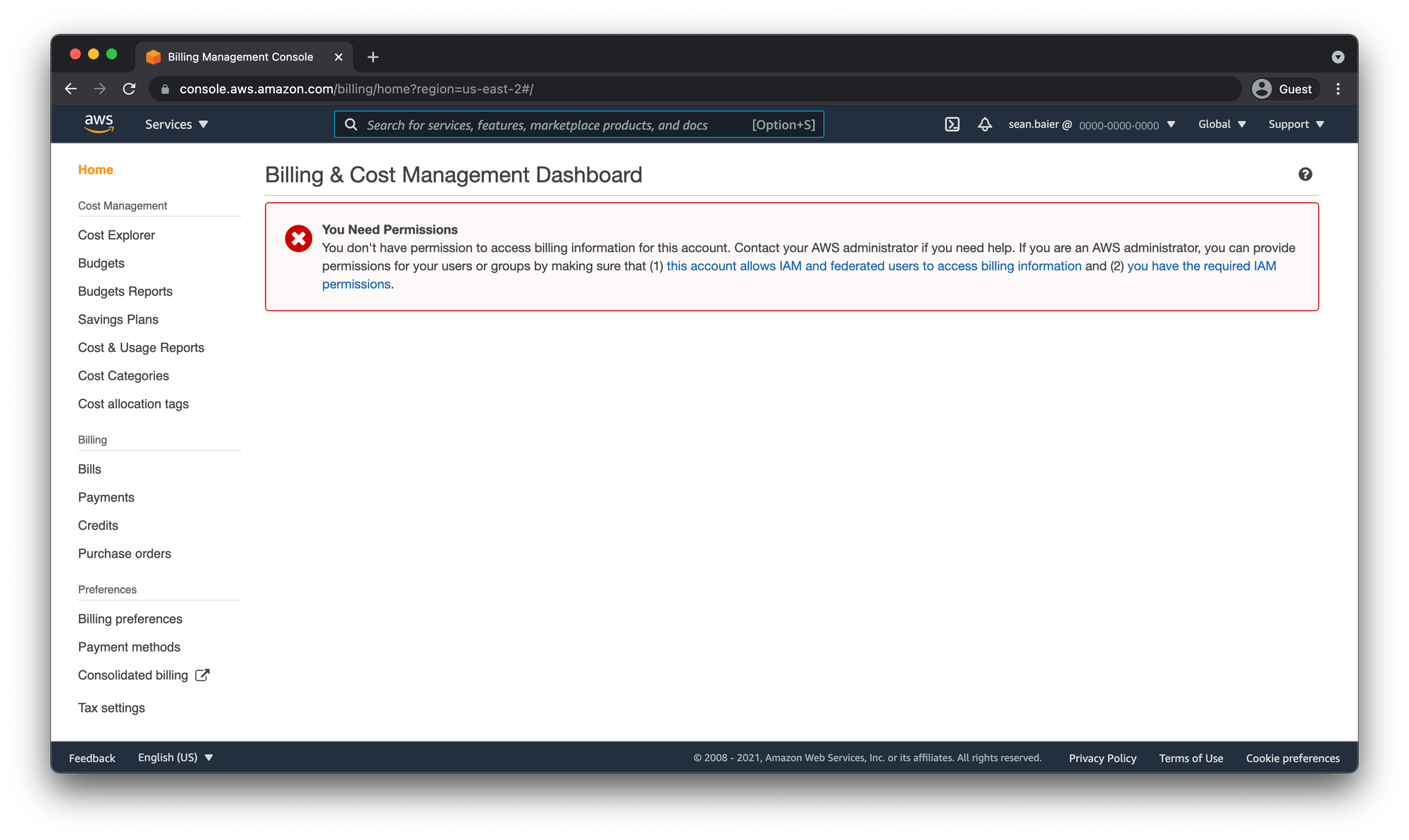 As mentioned before, access to billing by an IAM user is not enabled by default. There are multiple ways of handling billing info access. You can read up on the endless options here.
