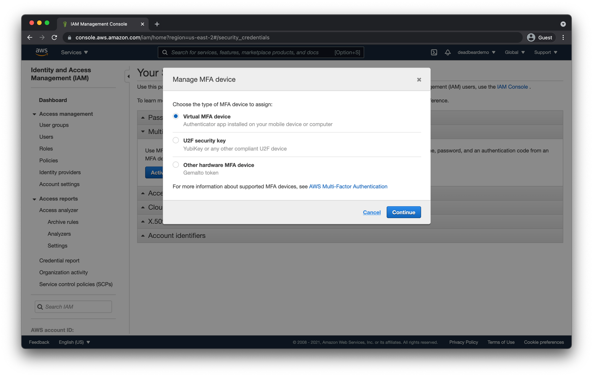 Let's start with enabling MFA on our Root account. If you've been living under a rock and don't know what MFA is, Multi-Factor Authentication enforces using some sort of external device to authenticate when signing in. It can be something like SMS (text message), email, or an authenticator app which is what we're going to use.