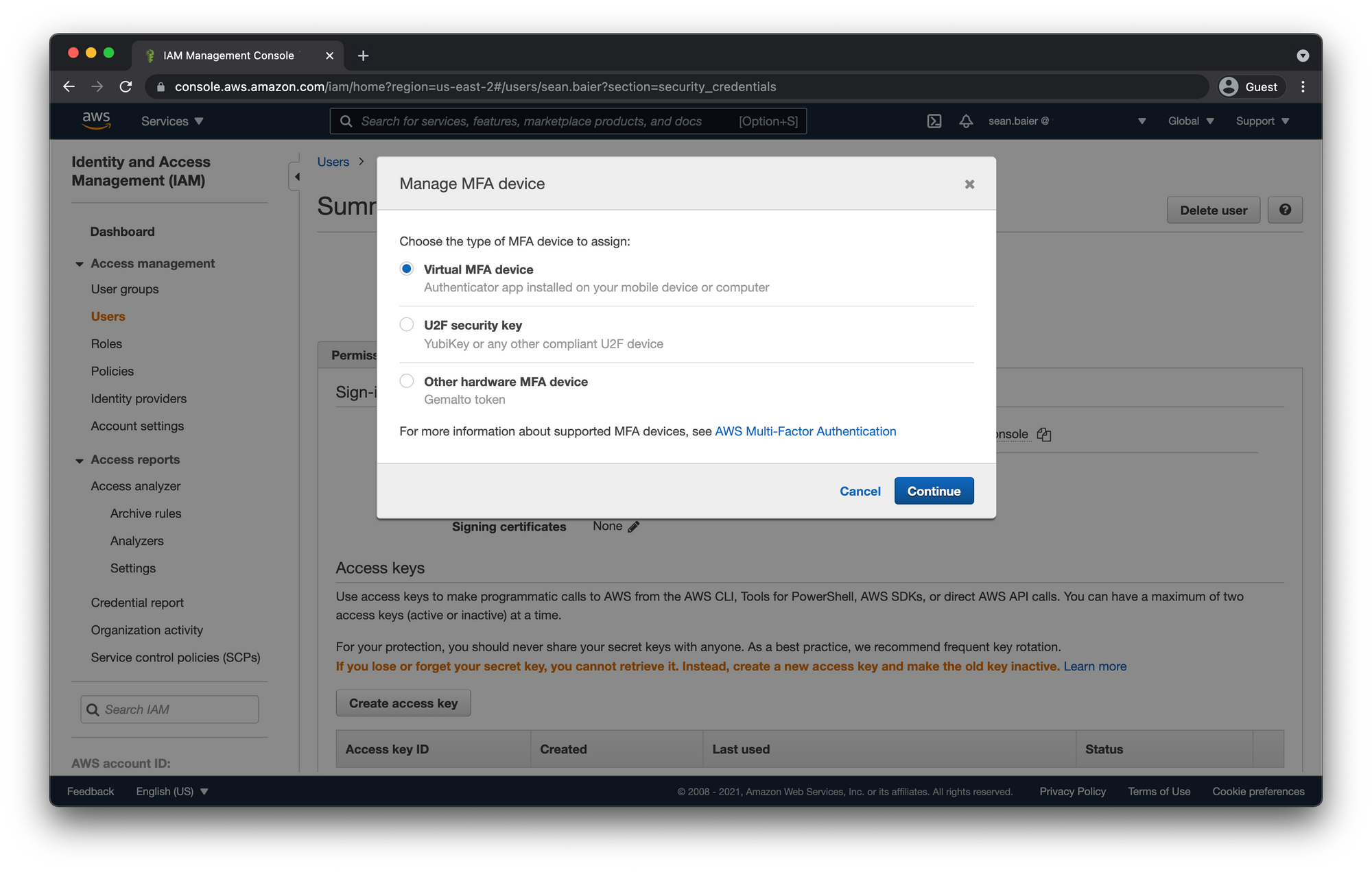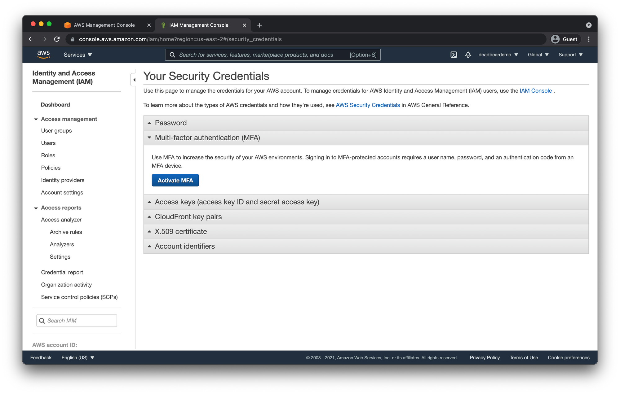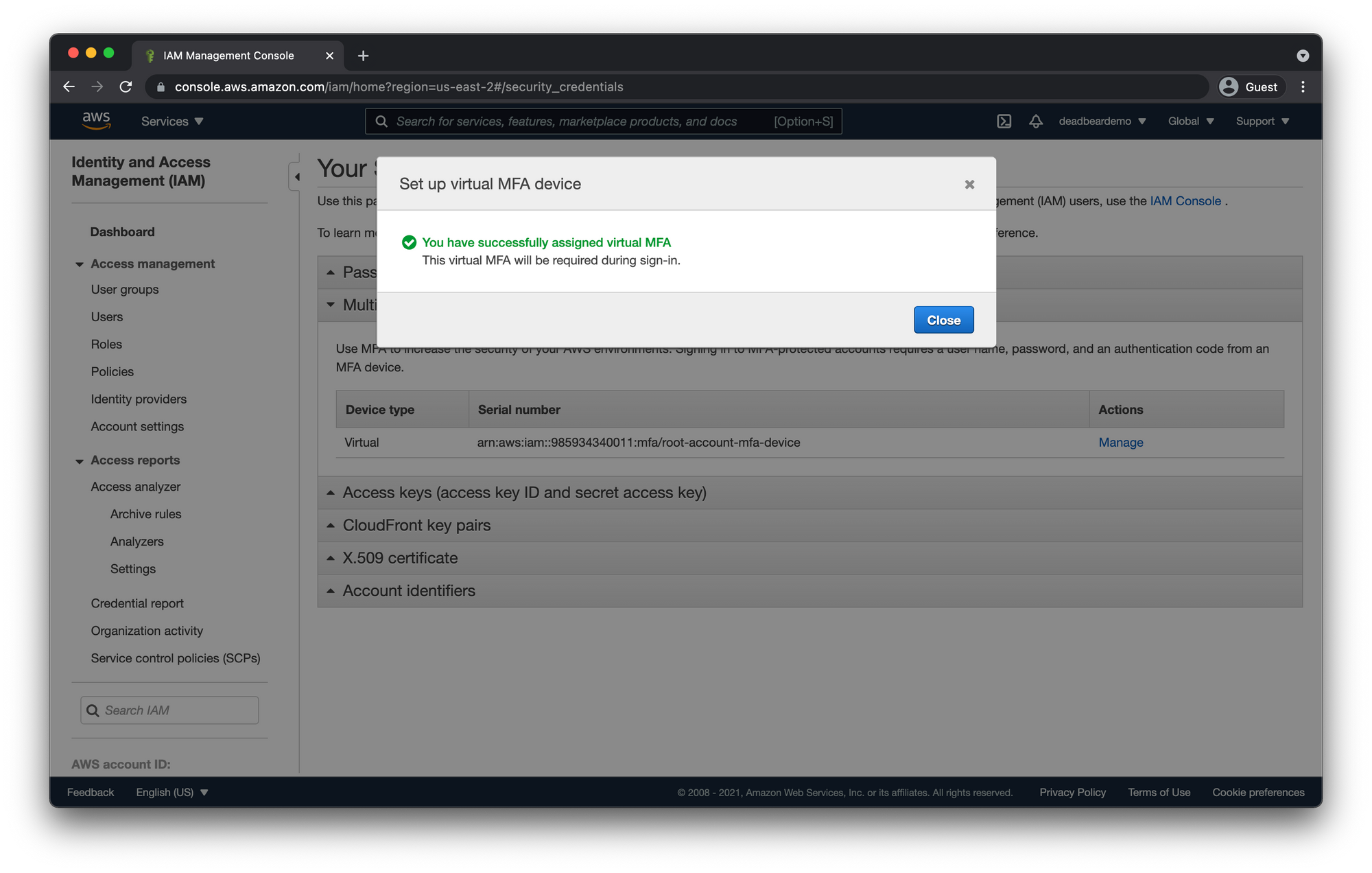 Sweet! Now that we have MFA Auth set up on our Root user account we are going to never use it again!