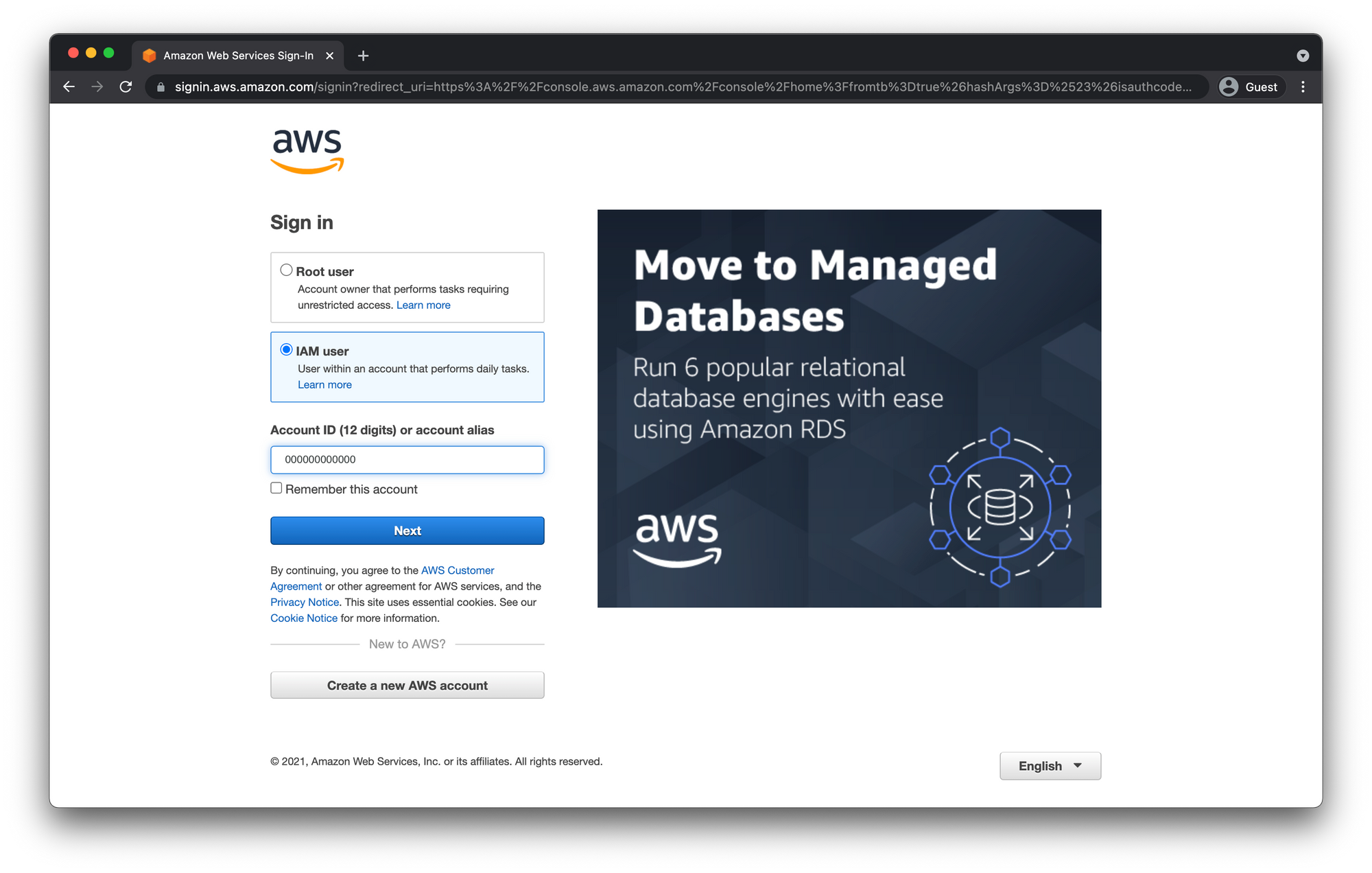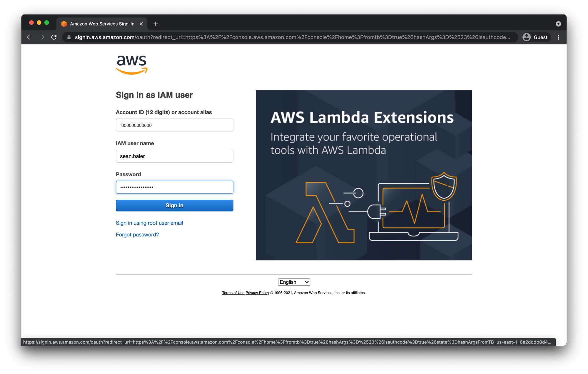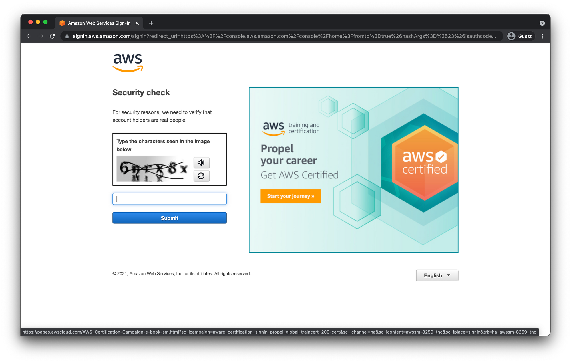 You might have to prove you're not a robot again. Then enter your user name and password from the IAM User we created.