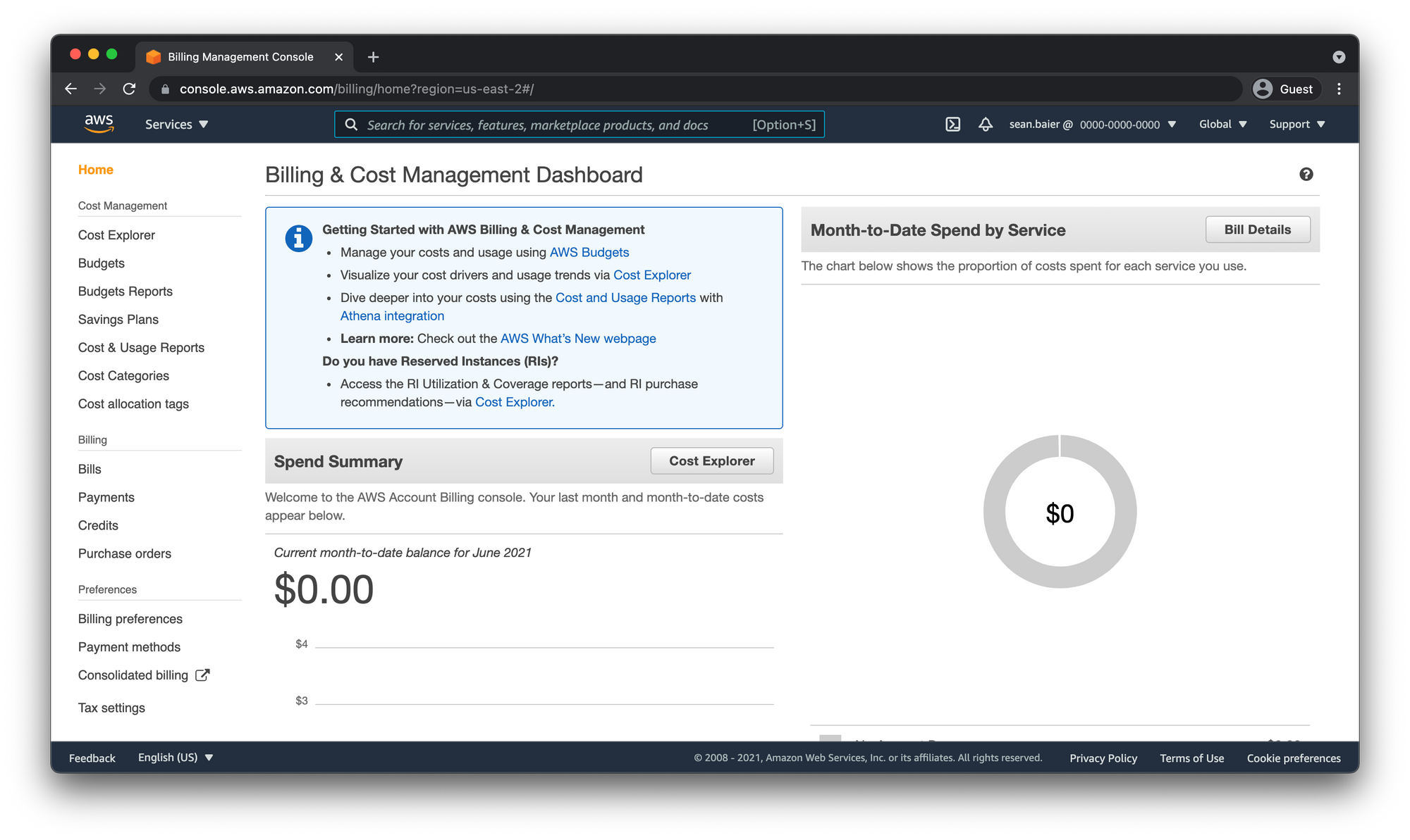 If your billing dashboard looks like this then your user doesn't have access to billing info and you should refer back to the section above to enable IAM User Access to Billing Information.