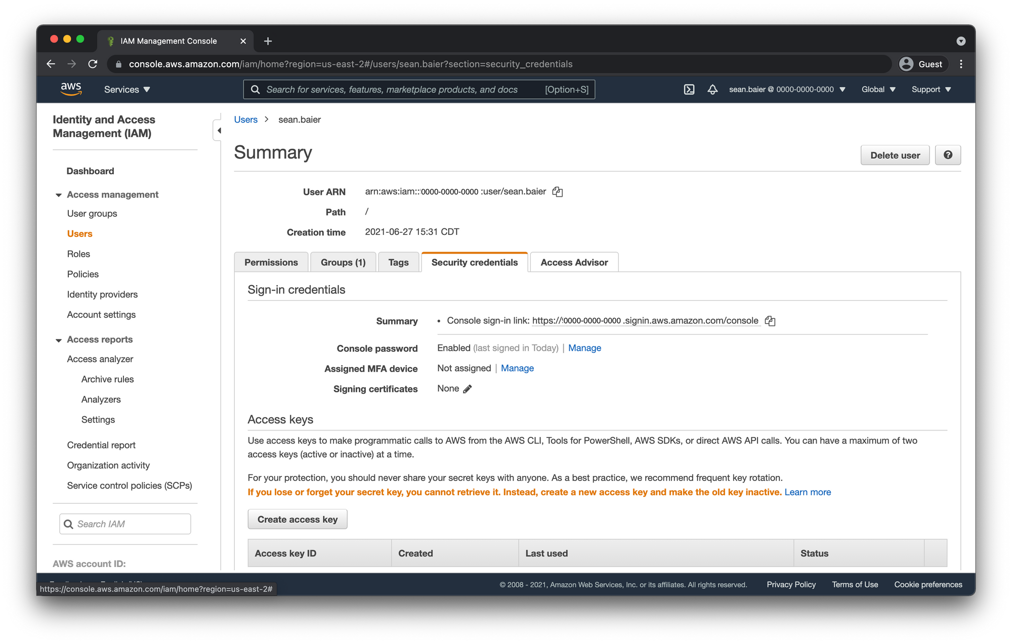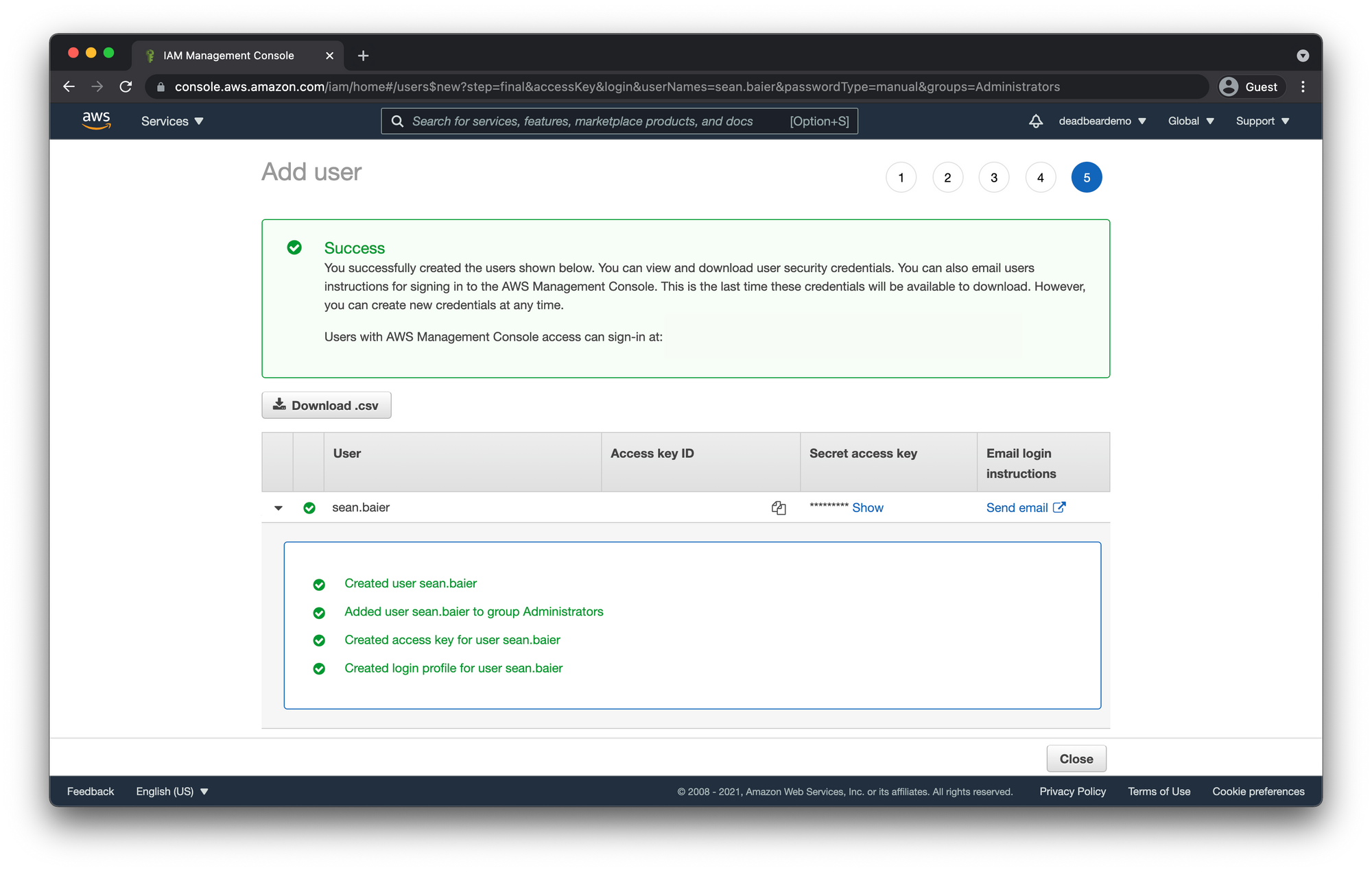 On successful creation you should see the newly created user resources. If you selected programmatic access you will also see both the Access key ID and Secret access key. Make sure you save these somewhere safe. This is what you will use in order to access AWS through developer tools and API's.