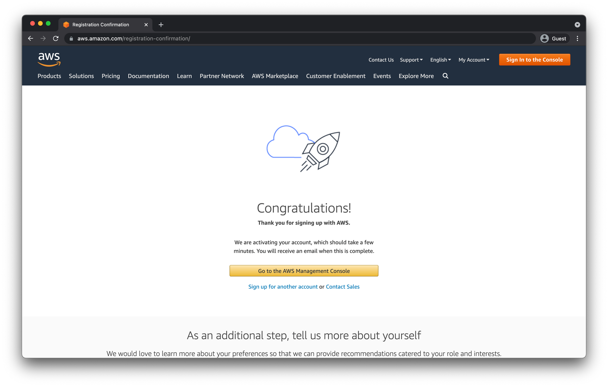 Click "Complete sign up" and on the "Congratulations" page click "Go to the AWS Management Console"