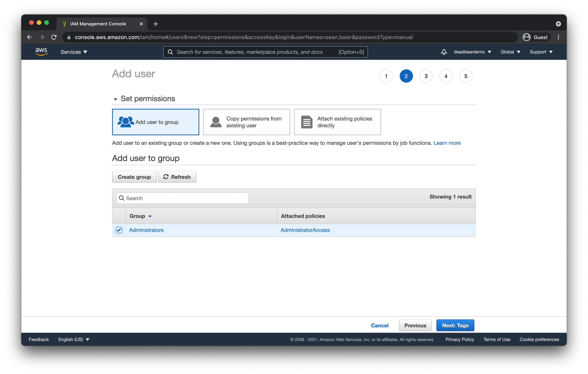 For our use case since we are using this IAM User as an administrator for ourselves we're going to give access to the Administrators group so we can use this User to manage our billing info.