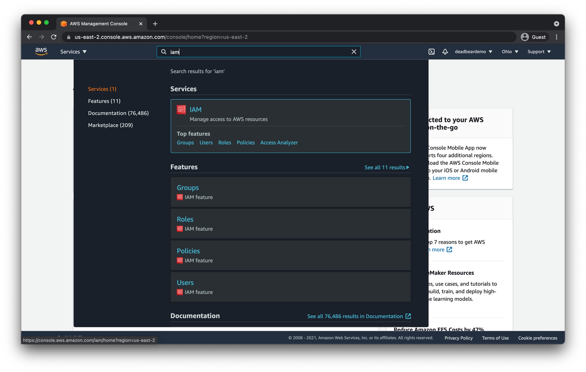 While logged into the Root user account in the AWS console, navigate to the top search bar and enter "iam" in order to find the Identity Access Management (IAM) dashboard.