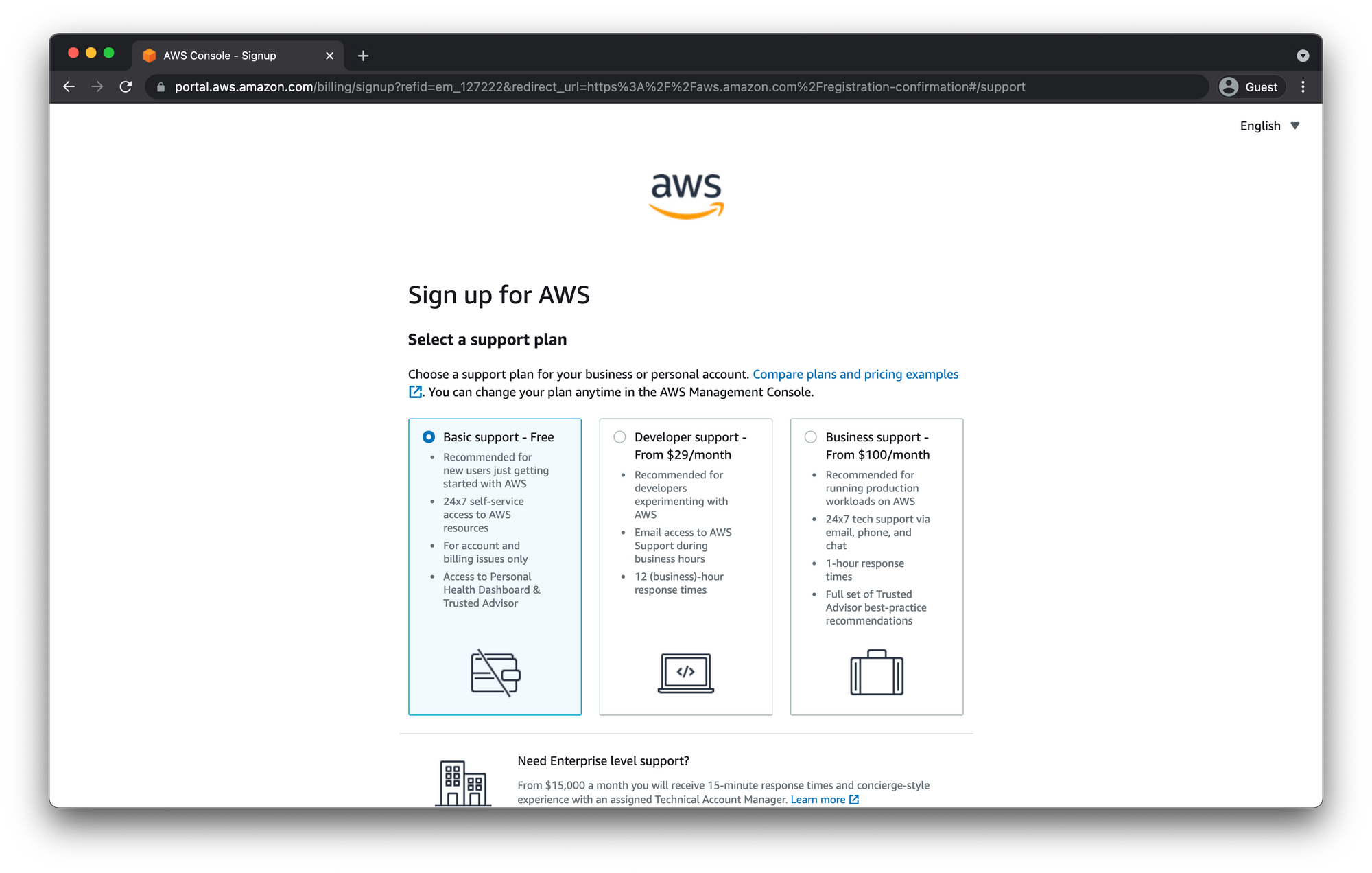 Finally you will be asked to select which Support Plan you want. The different plans are just support you get from Amazon for your account. They do not have any bearing on resources you have access to.