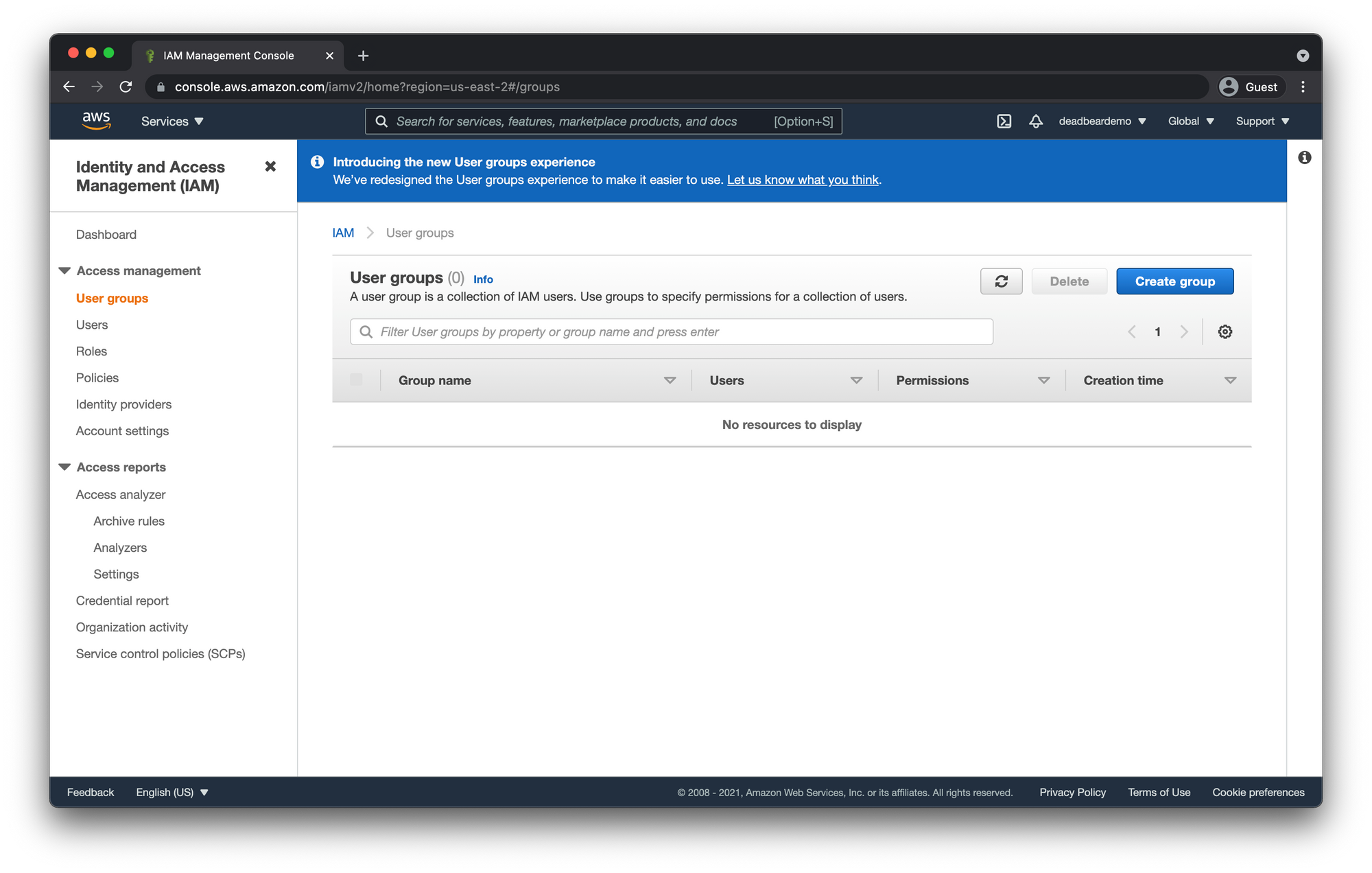 From the IAM dashboard click on "User groups" in the left-hand sidebar. Then click "Create Group"