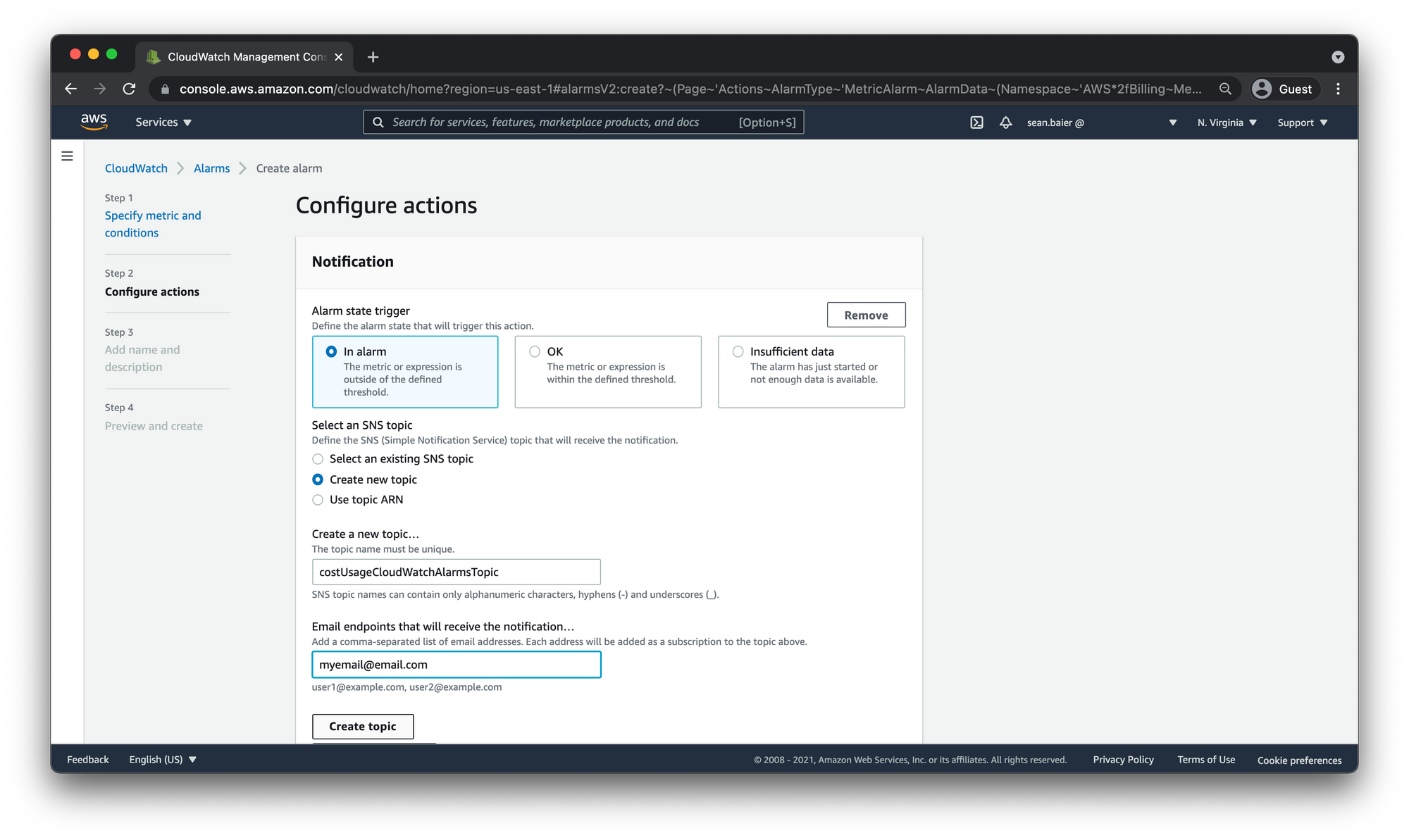 For Select an SNS topic, select "Create new topic" and then in the "Create a new topic..." input box give it a descriptive name. I'm going to call mine costUsageCloudWatchAlarmsTopic
