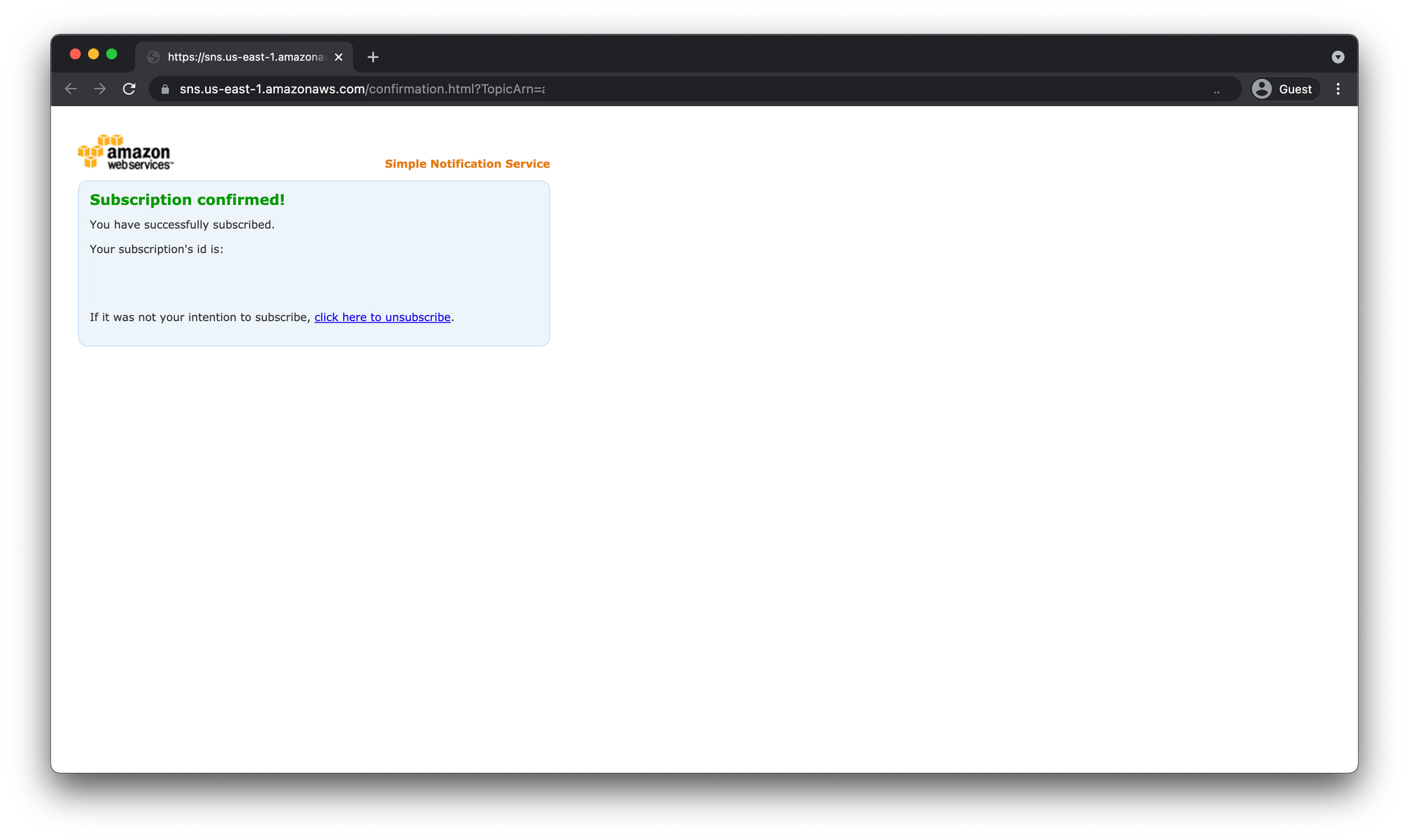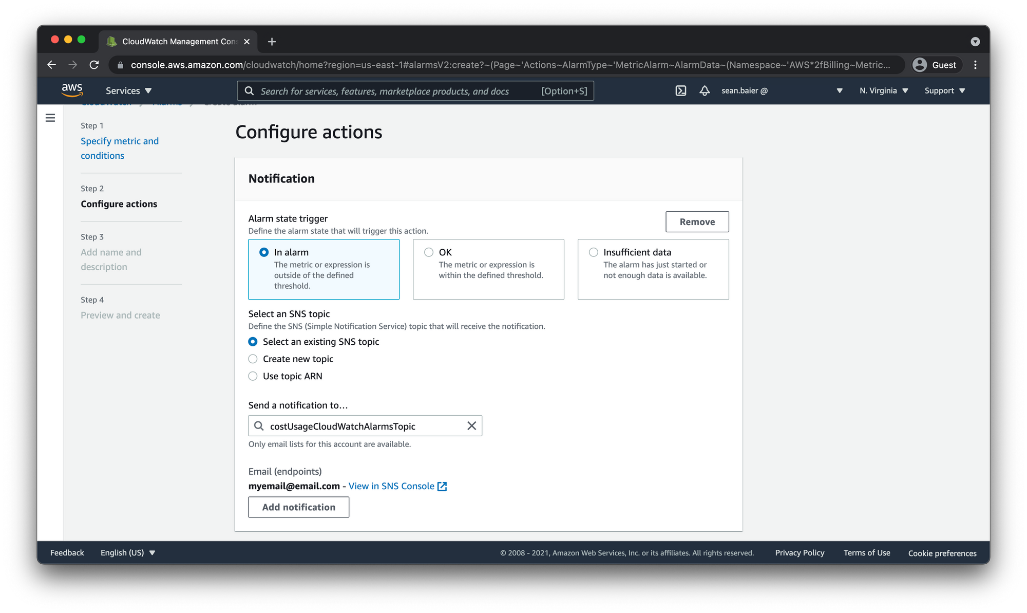 - The Select an SNS topic section should switch to have "Select an existing SNS topic" checked since we just created the topic we want to choose.