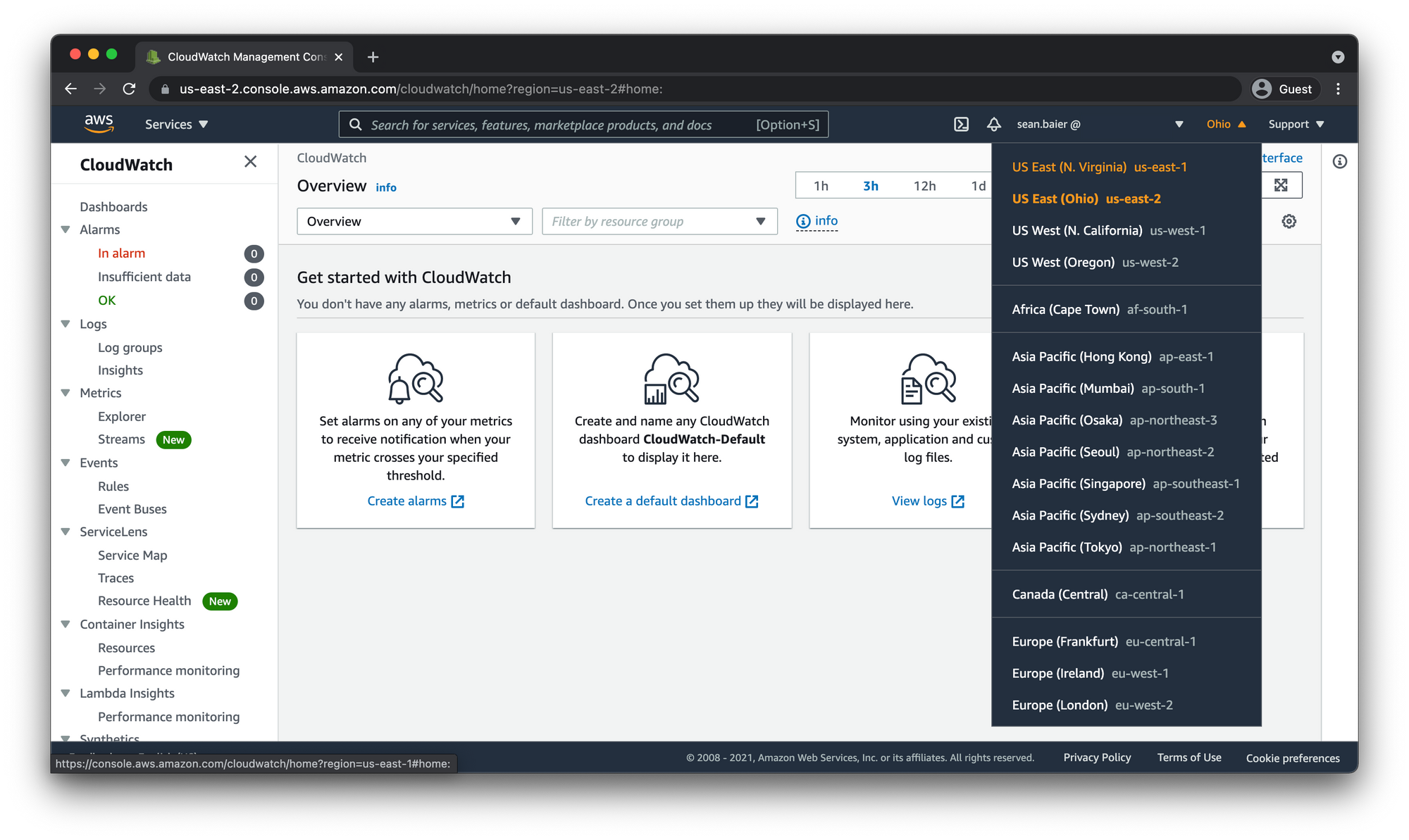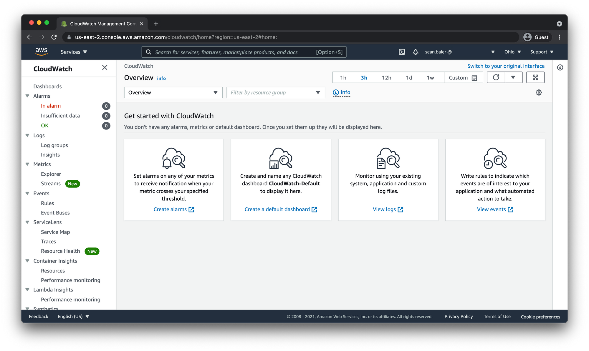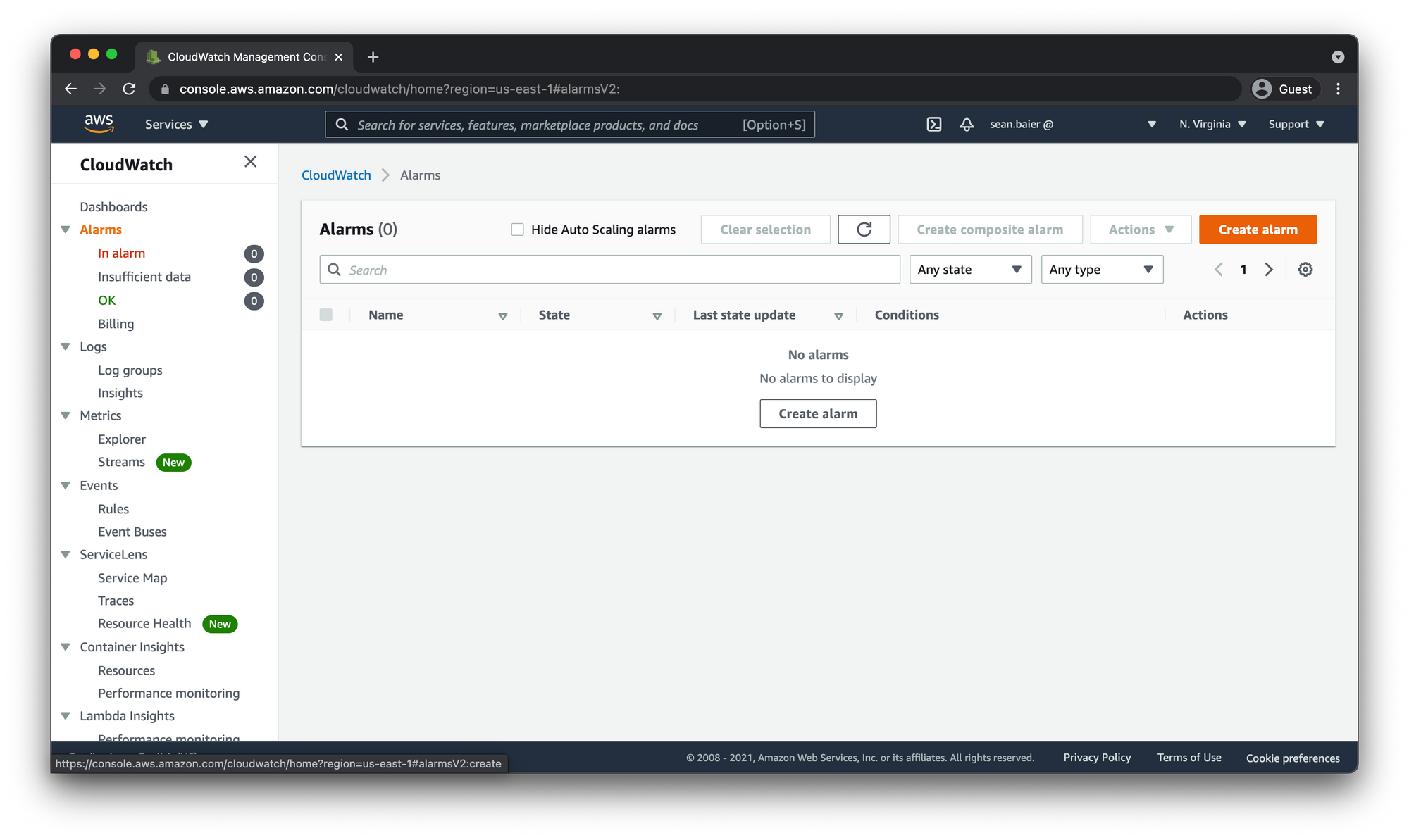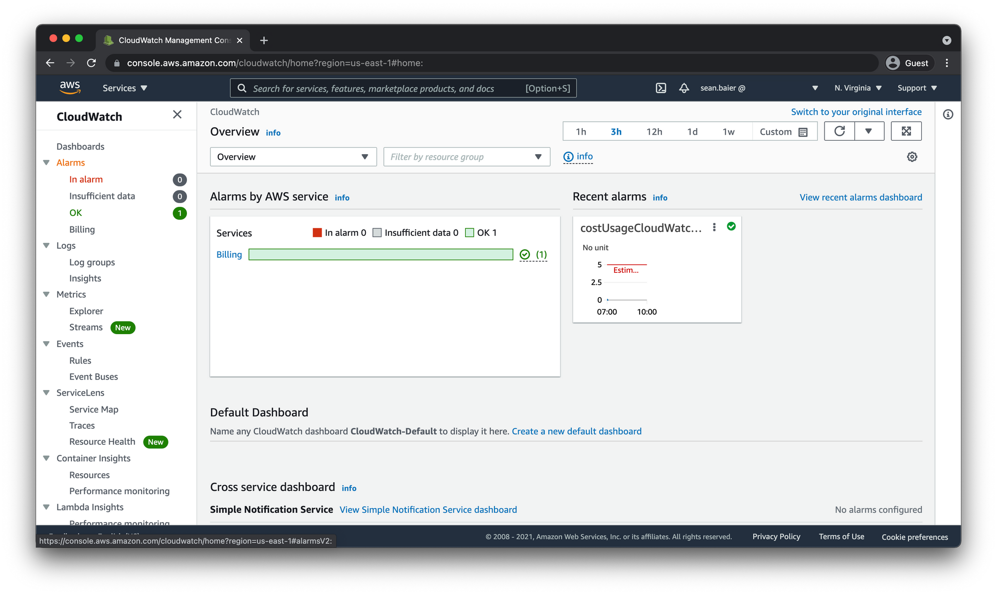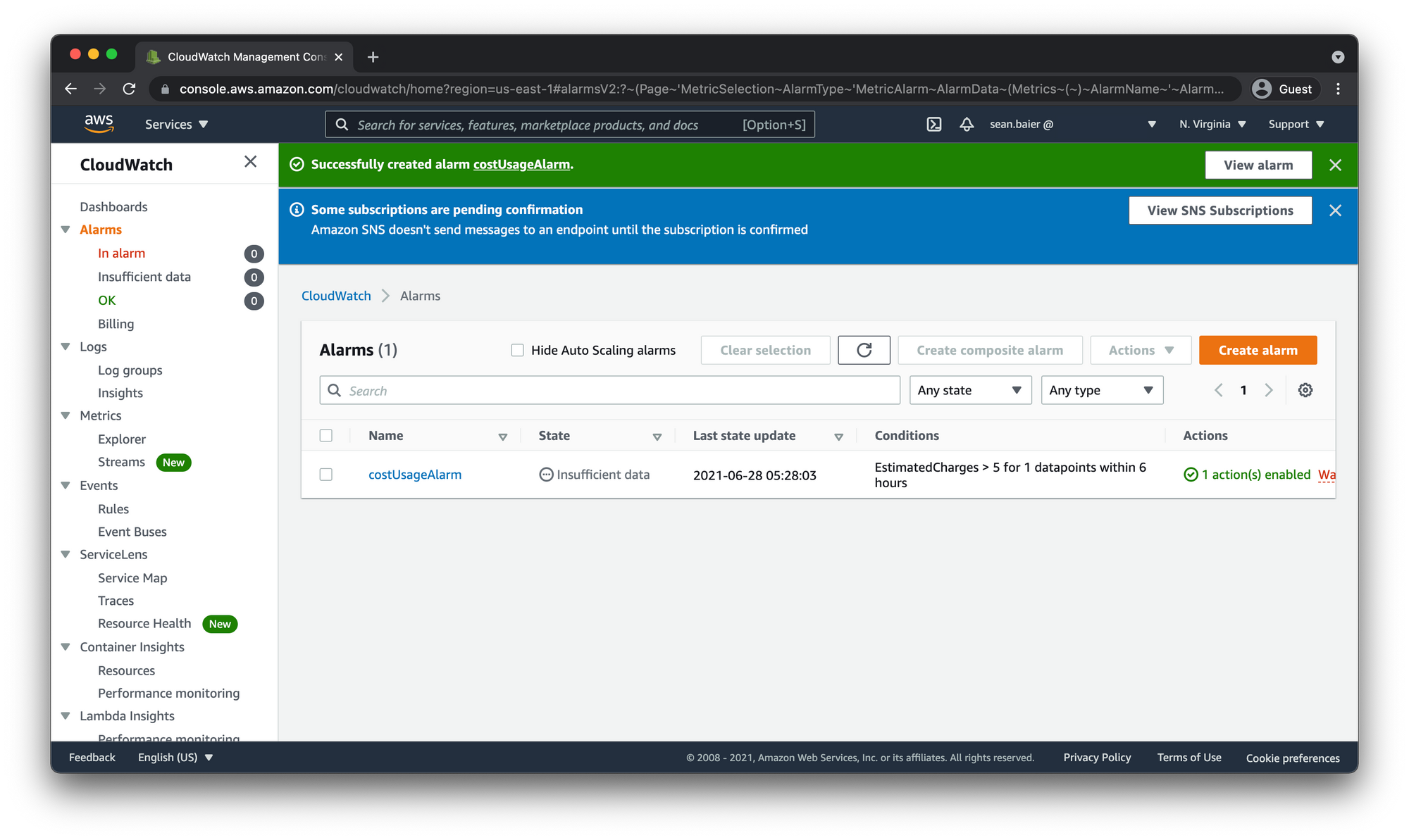 Now if you navigate back to the CloudWatch dashboard in the AWS Console your alarm should show up.