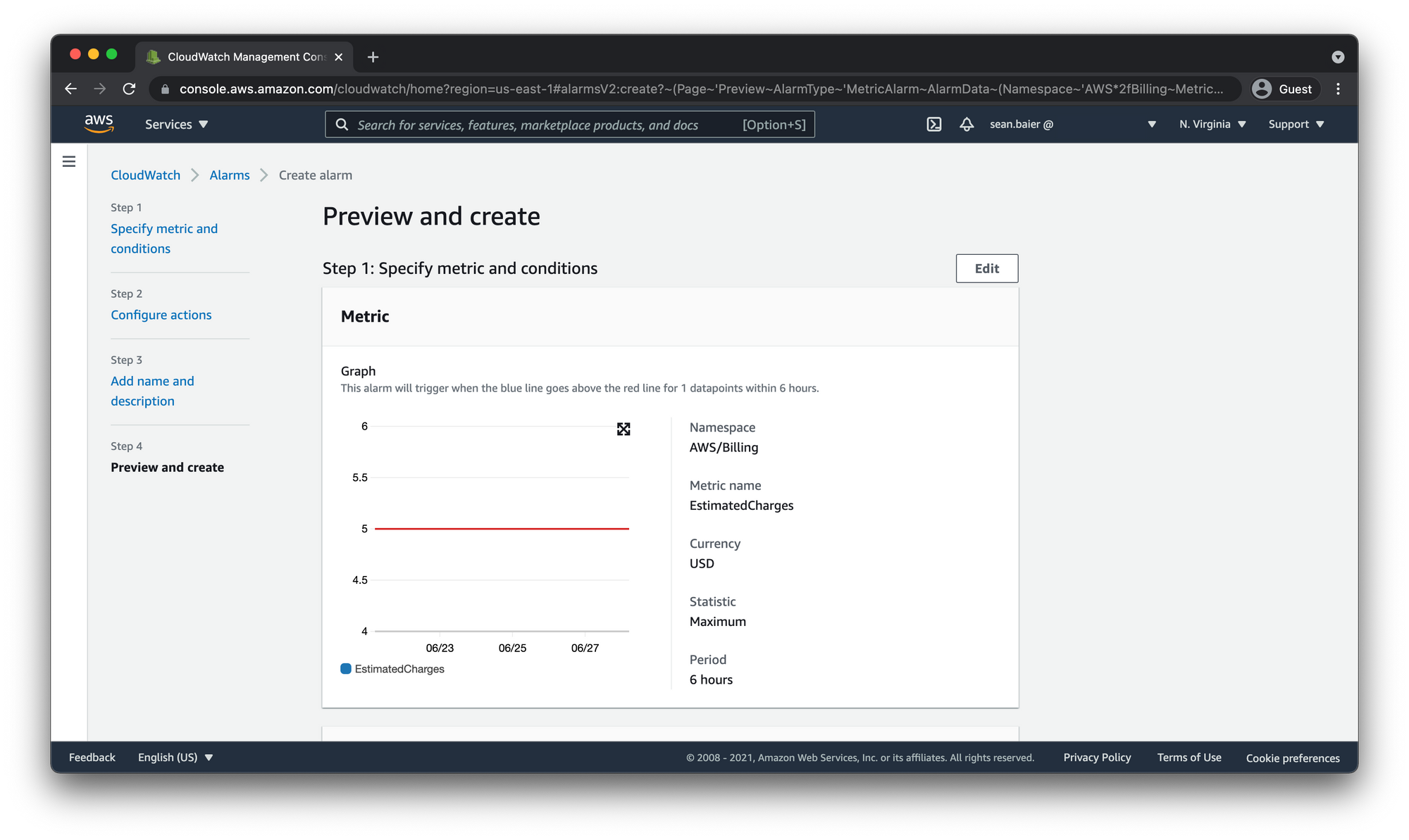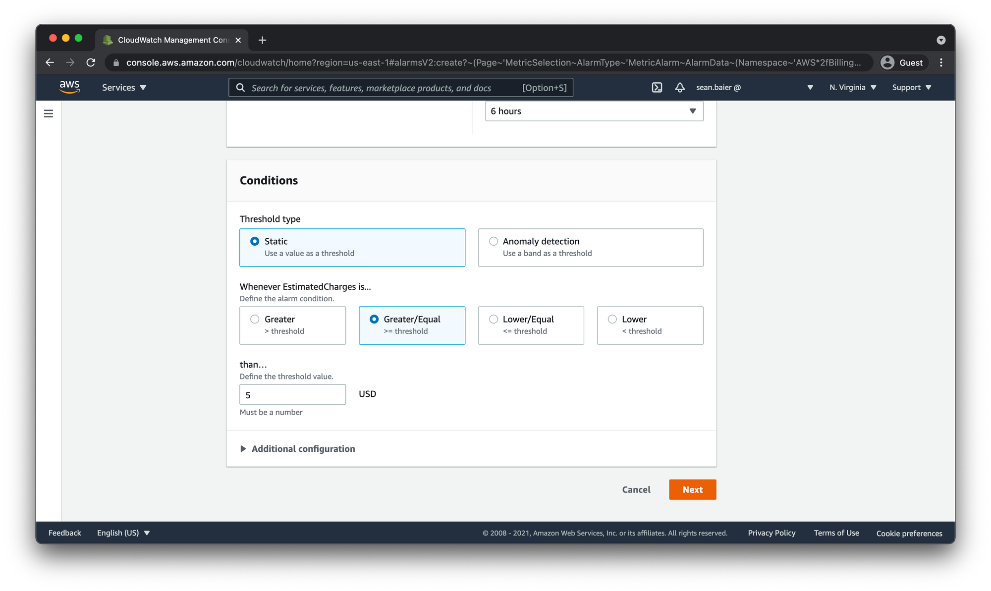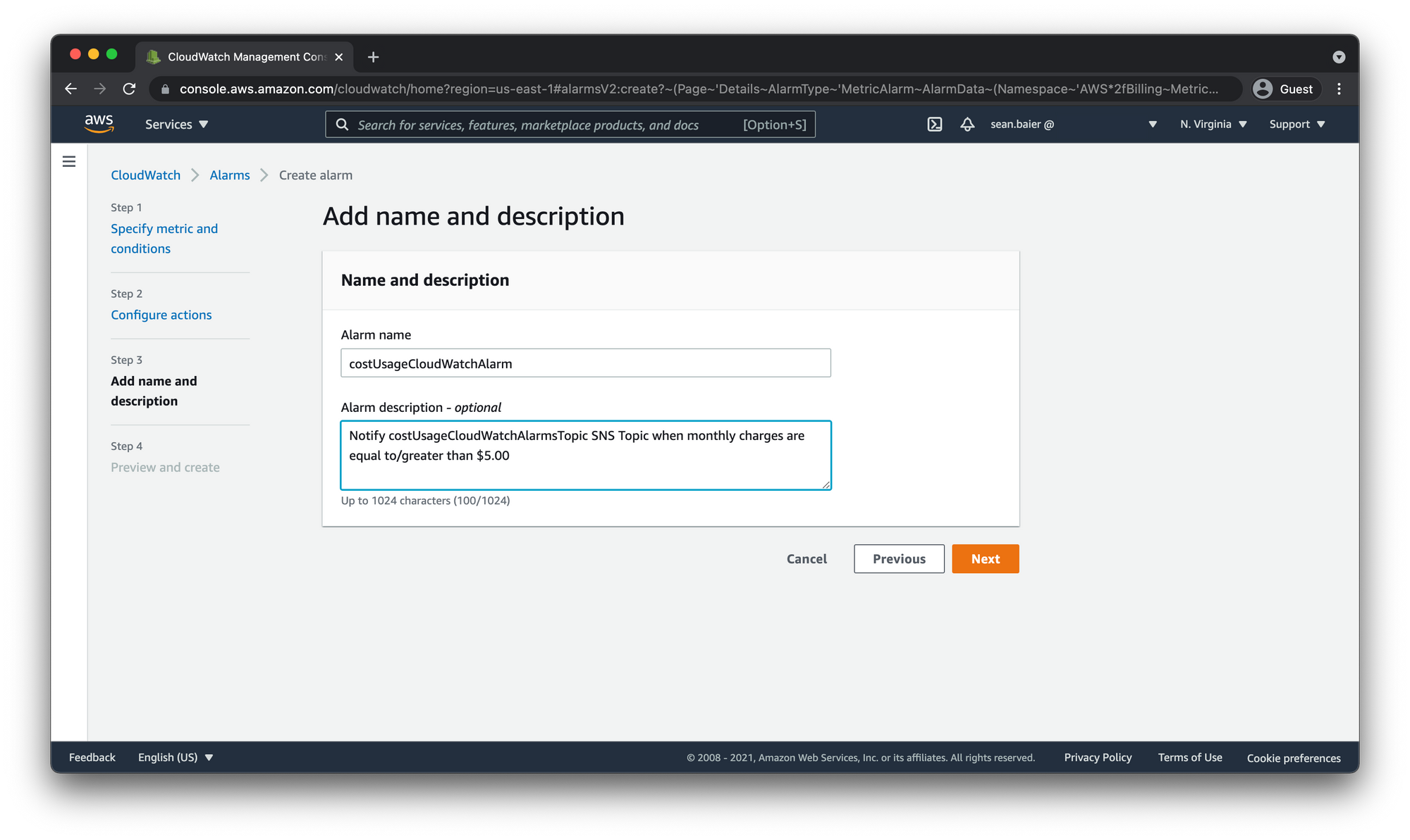 costUsageCloudWatchAlarmand give it the descriptionNotify costUsageCloudWatchAlarmsTopic SNS Topic when monthly charges are equal to/greater than $5.00 - Then choose Next