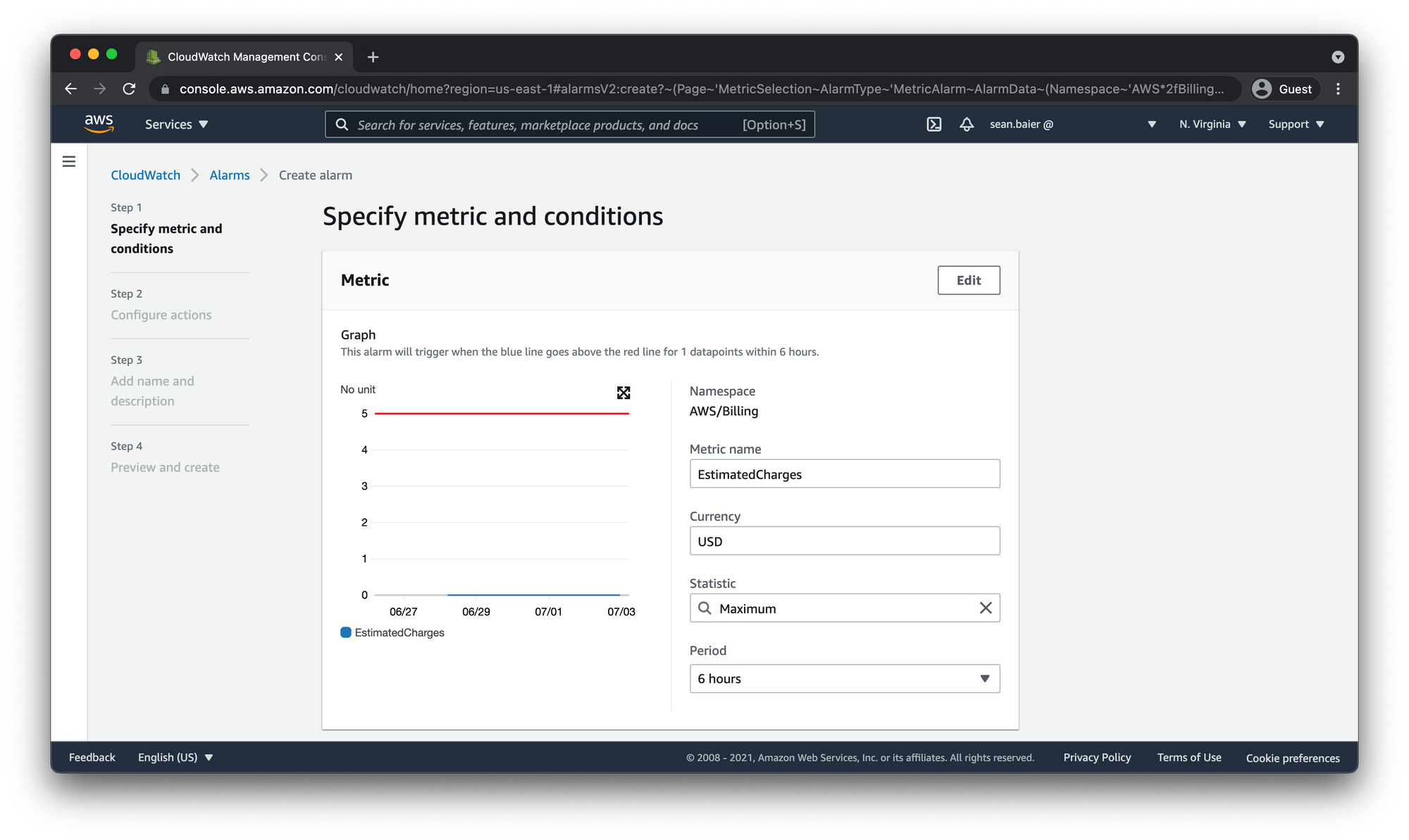 This next section is specifying the details of how you want CloudWatch to respond to your metric. You can leave Metric name, Currency, and Statistic as is. The important one to note here is the Period.