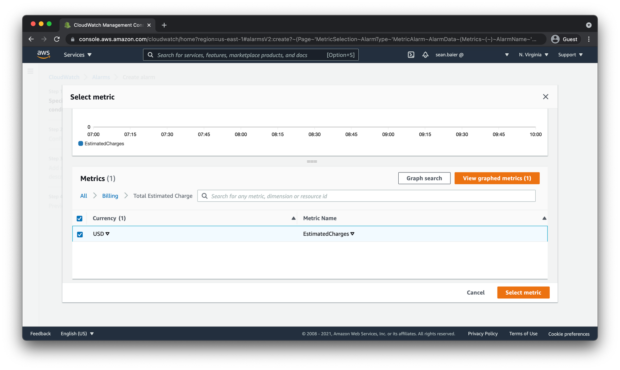 Select the check box next to EstimatedCharges, and choose Select metric.