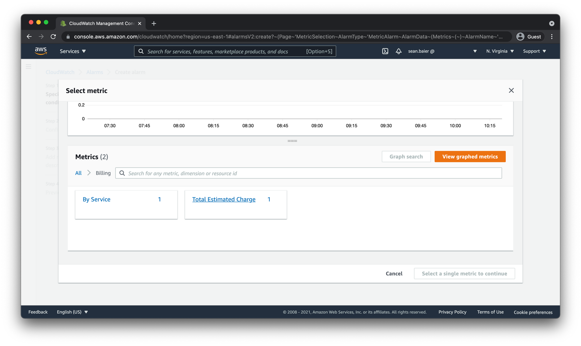 If you don't see Billing or the Total Estimated Charge metric, you may need to enable billing alerts. For more information, see Enabling billing alerts above.