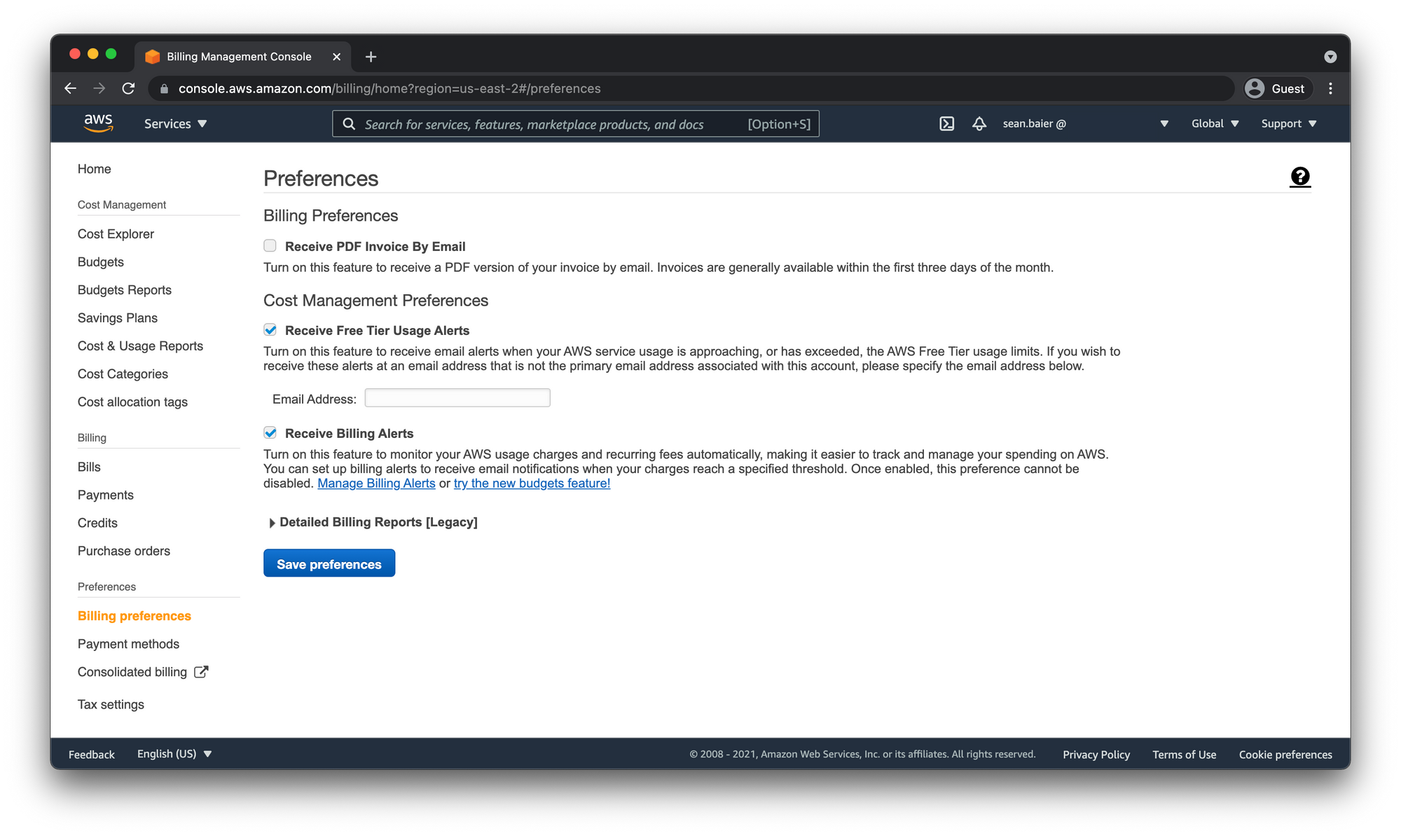 First we have to enable billing alerts. So back in the Billing Preferences dashboard also check the "Receive Billing Alerts" box and click "Save preferences"