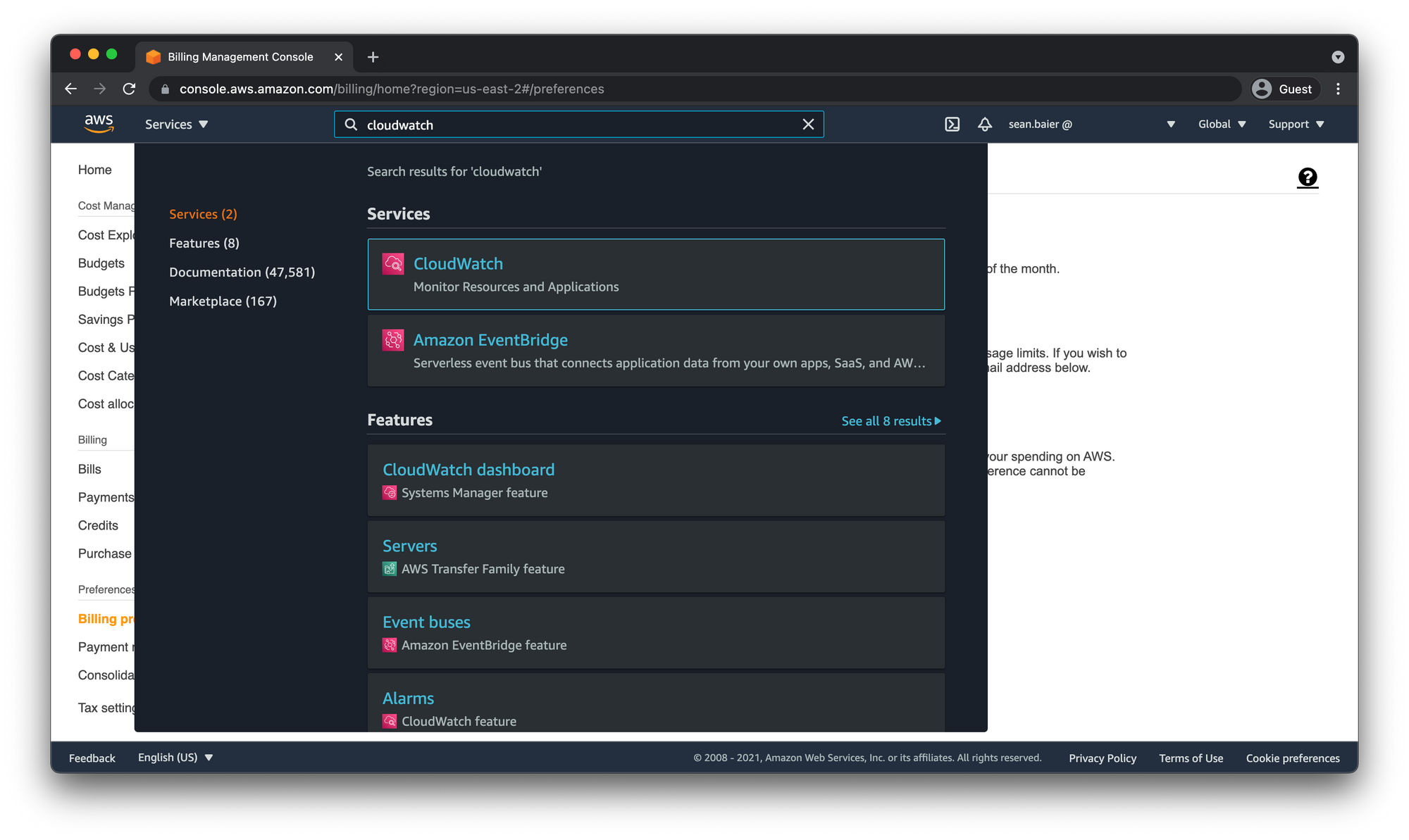 Open the CloudWatch dashboard by searching "cloudwatch" in the top search bar.