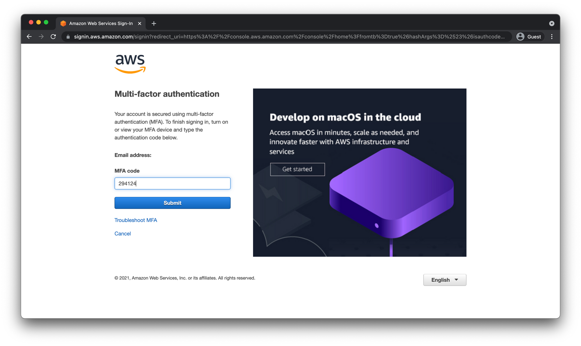 Finally lets double check our MFA works by logging out and signing back in with our IAM User the same way we did before.